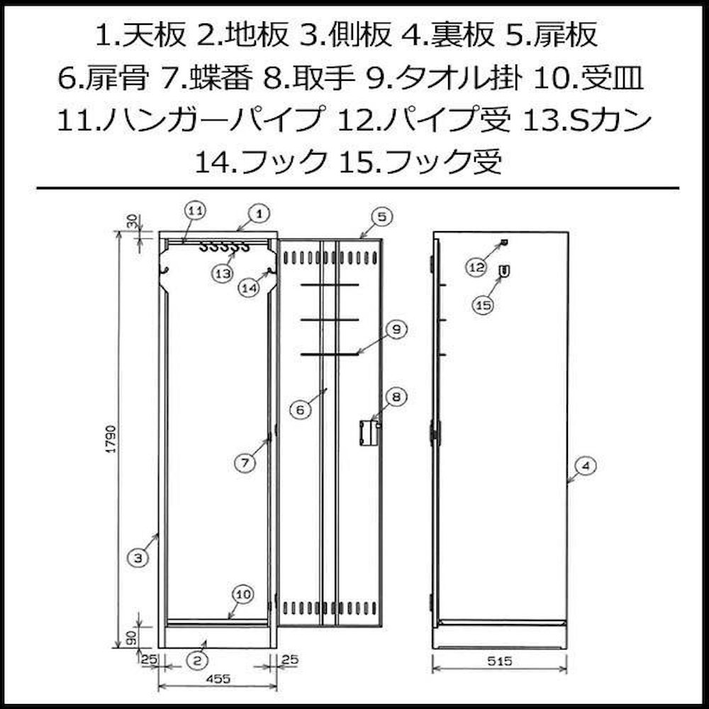 サイズ:【外寸】W455×D515×H1790mm【内寸】W387×D465×H1650mm、重量:24.1kg、仕様:錠なし・完成品、付属品:取扱説明書・保証書