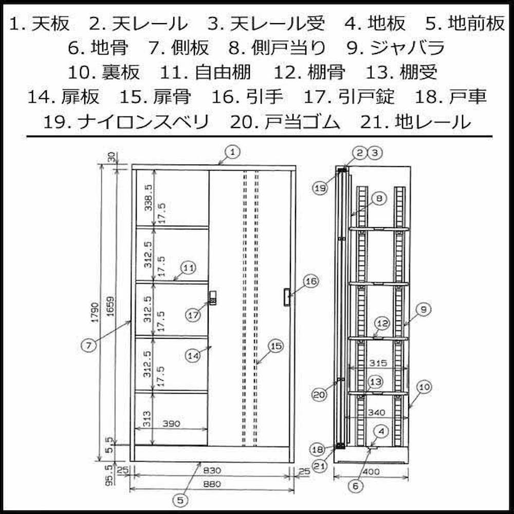 本体:スチール、戸車・ナイロンスベリ:PA樹脂、引手・引戸錠:ABS樹脂、戸当ゴム:ゴム、地レール:SGCC