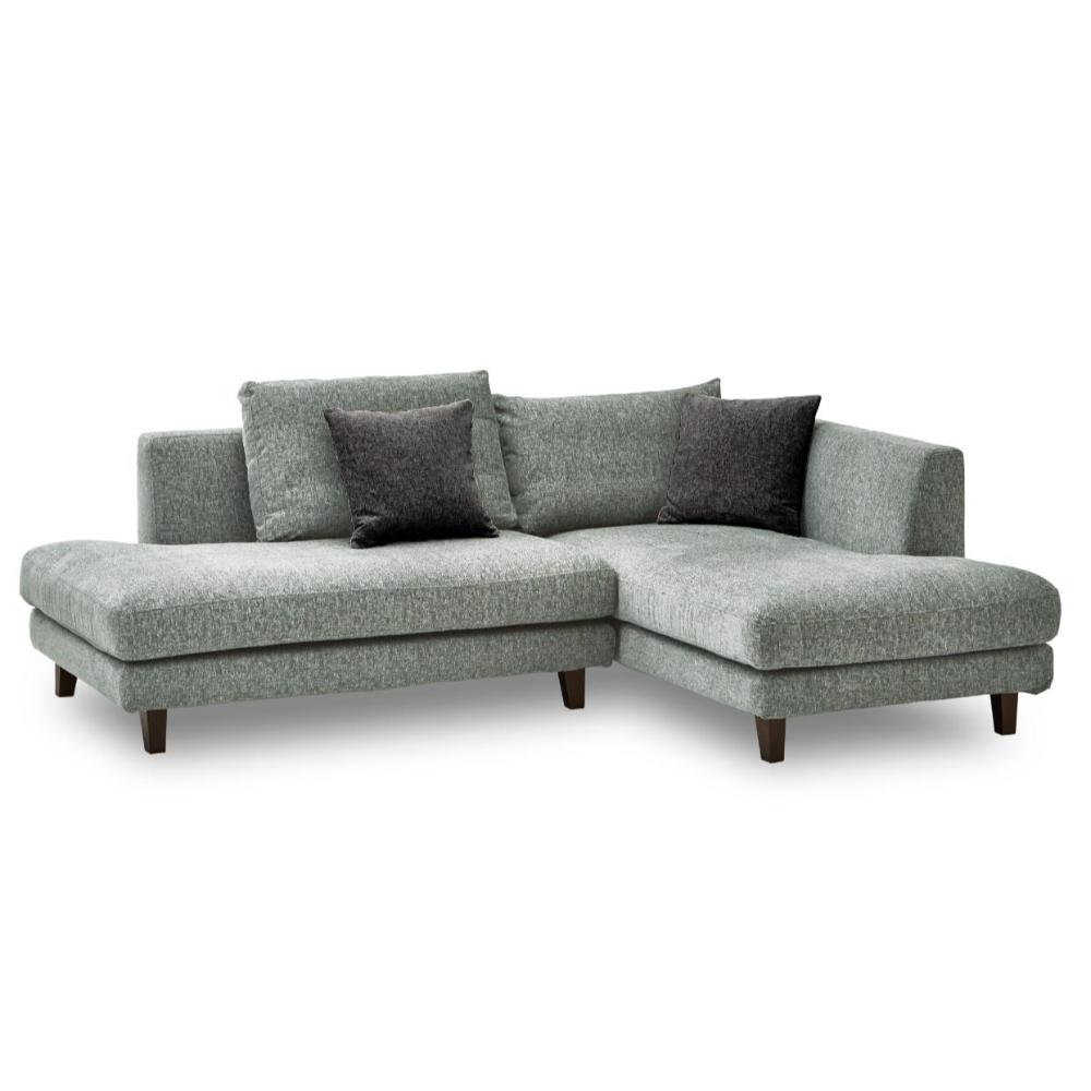 背クッションと座面クッションにフェザー入りの左カウチソファ。