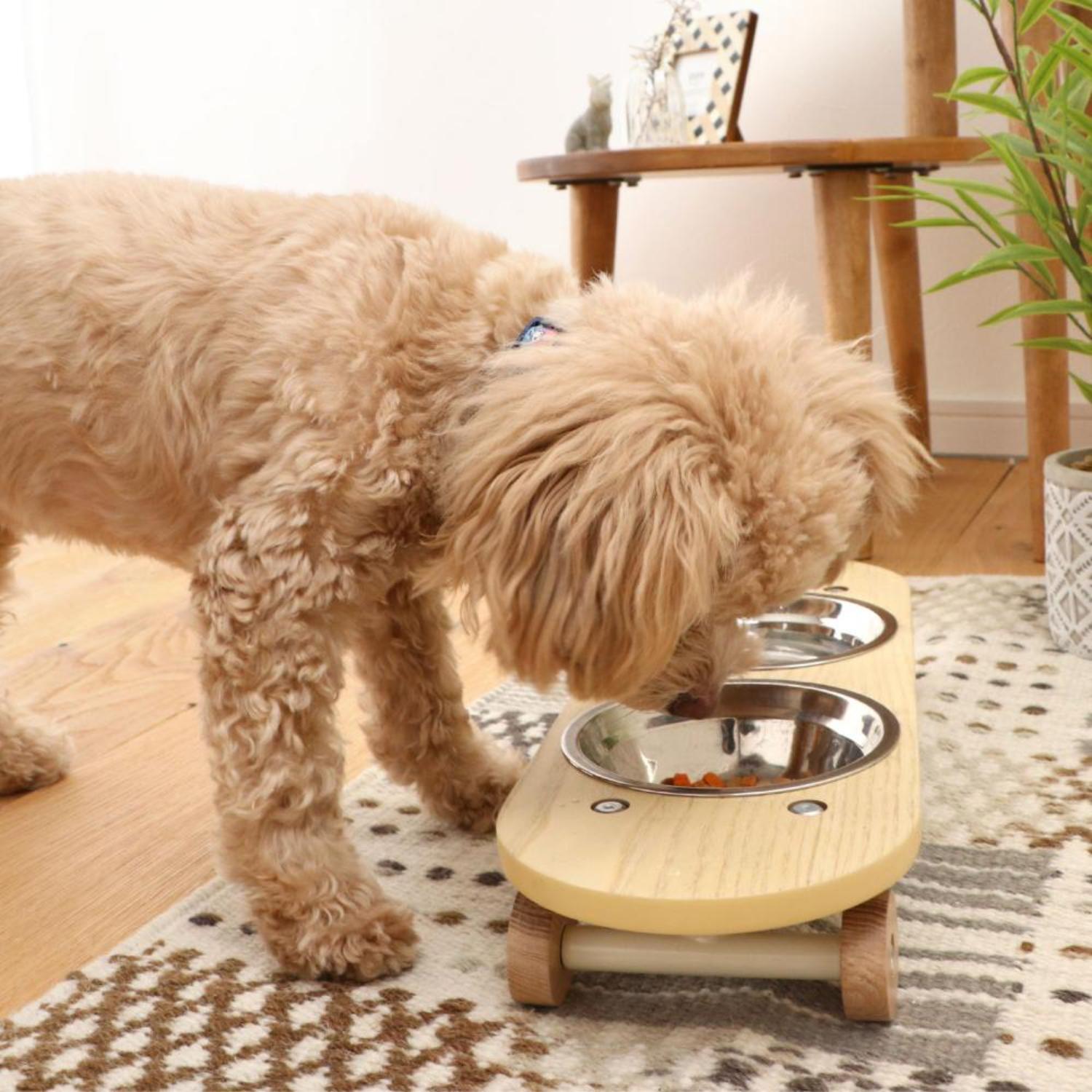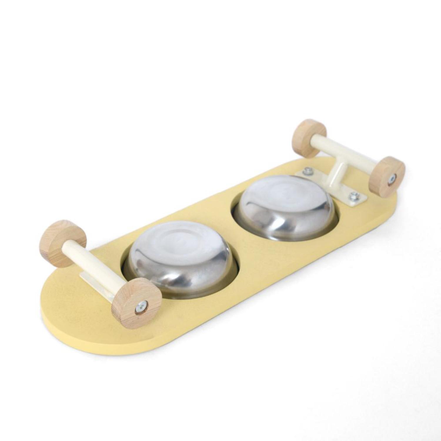 遊び心くすぐるスケボー風エサ皿。 ●フェイクタイヤで、動かないから安心 ●お皿はステンレスで取り外し可能。お手入れも簡単。 ●小サイズと大サイズの2サイズ展開。小は小型、大は中型~大型犬用。ネコも可。