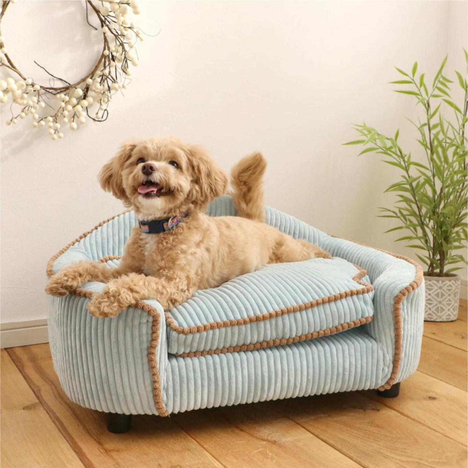 コーデュロイ生地が可愛らしいペットソファ。 ●脚を取り外せば、お年寄りのワンちゃんでも大丈夫。 ●ファスナー付きクッション。取りはずして手洗い可能。 ●木フレームが入っているので、形状崩れの心配無し。 ●ふかふかのクッション。ぐっすりお昼寝できます。