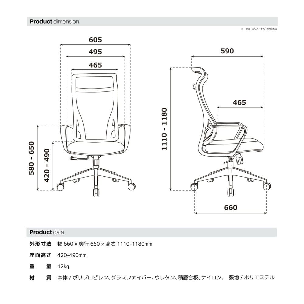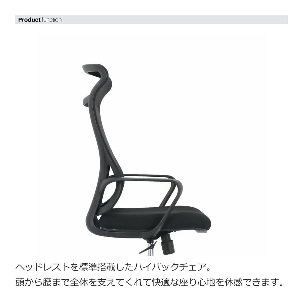 張地やフレーム、キャスターベースまでをワントーンカラーで統一したメッシュチェア。背もたれはハイバック仕様になっており、頭部や首をしっかりと支えます。メッシュ生地のため、通気性が良好です。昇降機能とロッキング機能付き。