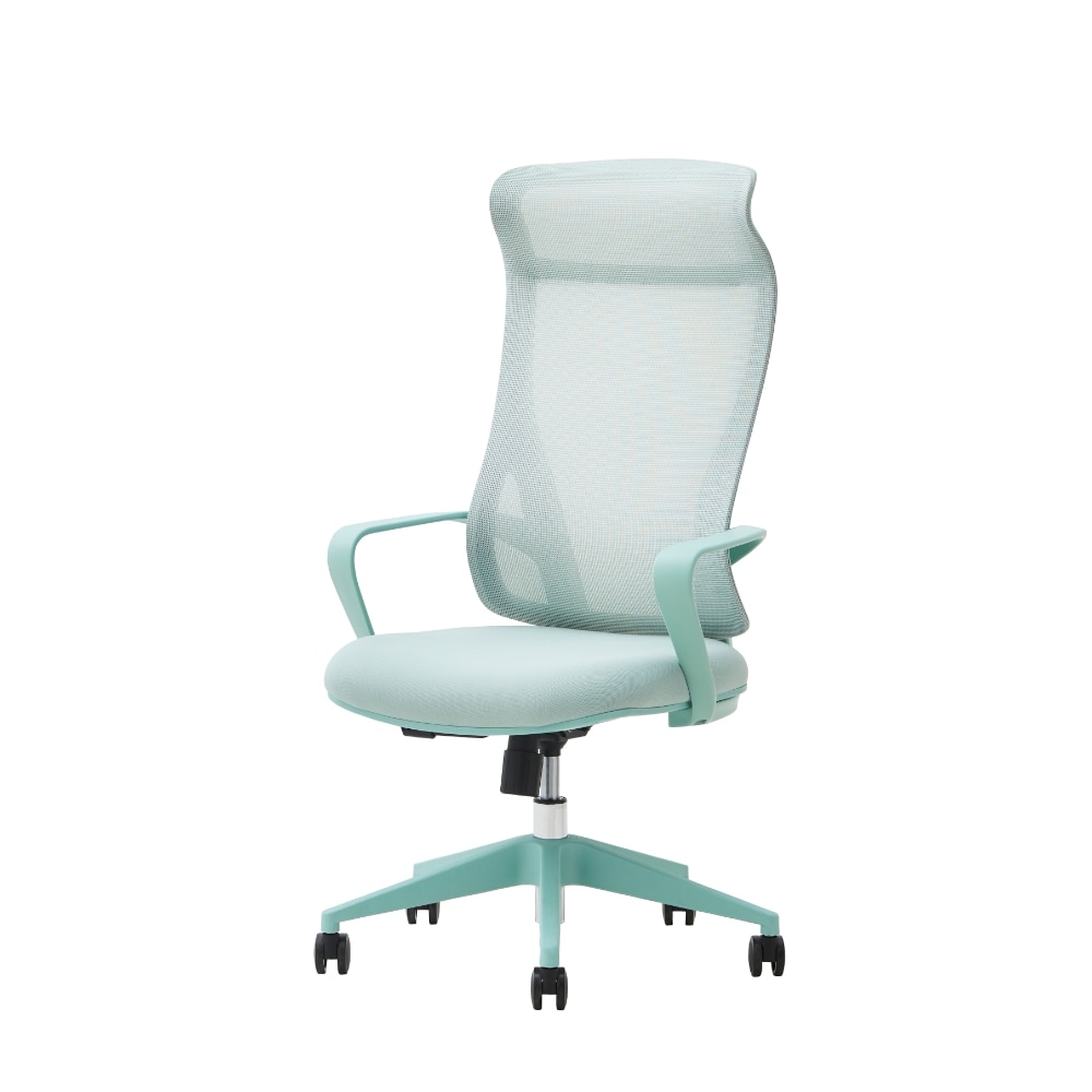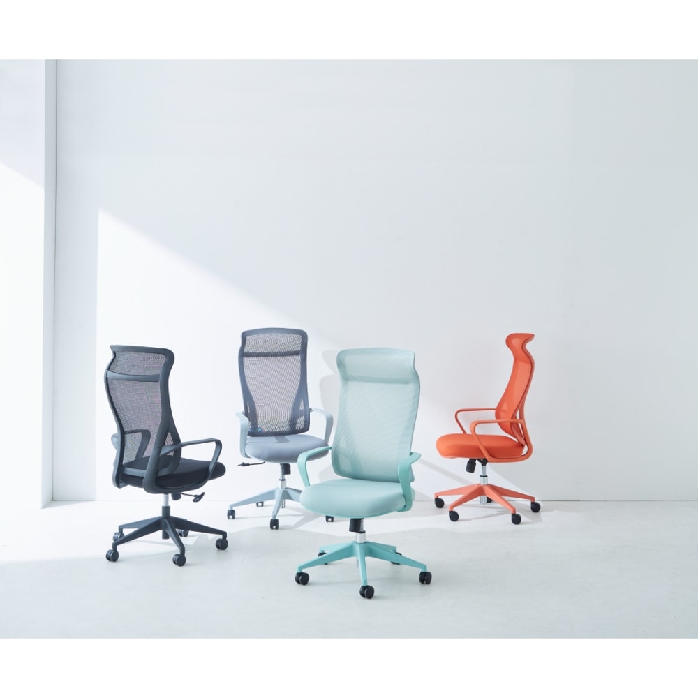 張地やフレーム、キャスターベースまでをワントーンカラーで統一したメッシュチェア。背もたれはハイバック仕様になっており、頭部や首をしっかりと支えます。メッシュ生地のため、通気性が良好です。昇降機能とロッキング機能付き。