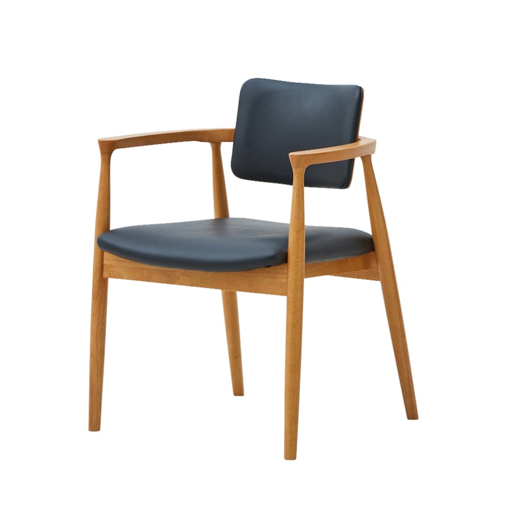 背もたれから肘にかけての曲線が美しいダイニングチェア。曲線を描いた背もたれが体にフィットし、心地よく支えてくれます。背面にさくりを入れており、出し入れがしやすくなっております。