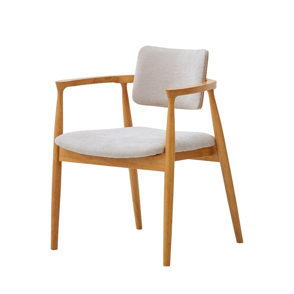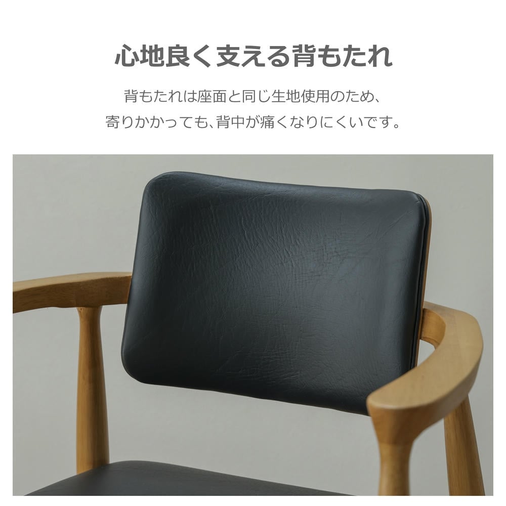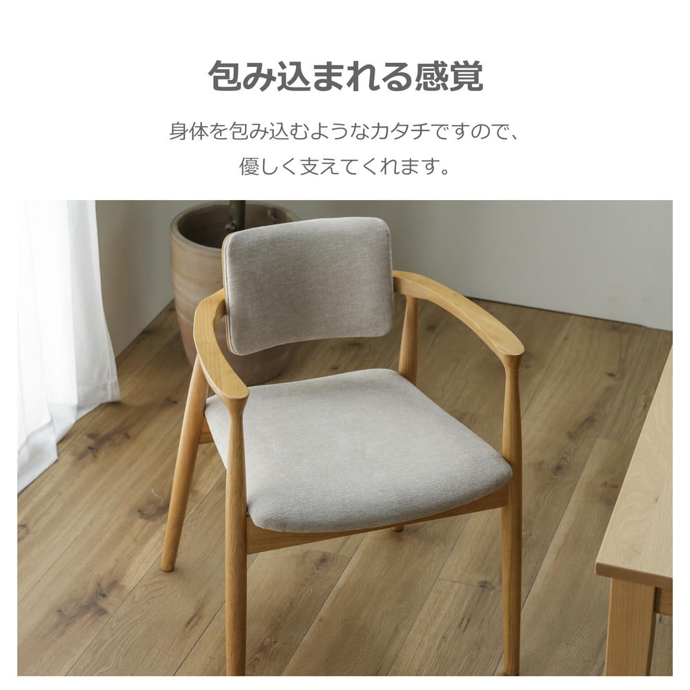 背もたれから肘にかけての曲線が美しいダイニングチェア。曲線を描いた背もたれが体にフィットし、心地よく支えてくれます。背面にさくりを入れており、出し入れがしやすくなっております。