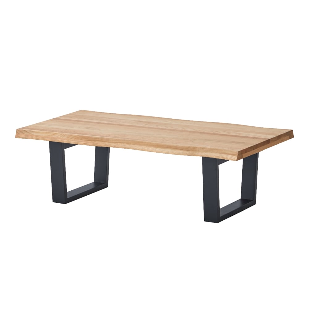 無垢天板のセンターテーブル。無垢天板になぐり加工を施しており、黒脚との組み合わせが天板の美しさをより一層引き立てます。天板はオイル塗装。