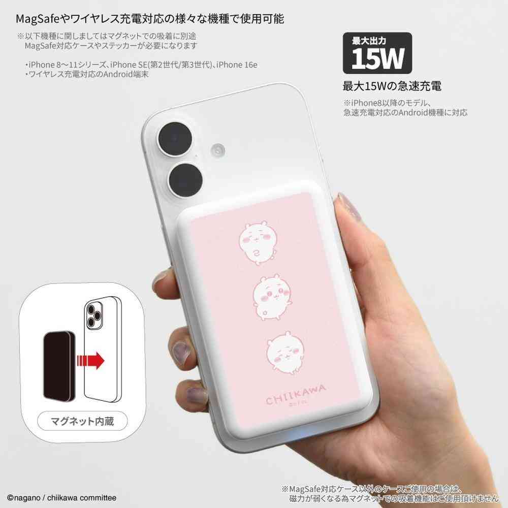 磁力でピタッと装着できる、持ち運びに便利なMagSafe対応リチウムイオンポリマー充電器です。PSE規格適合。 電池容量は5000mAhで、最大15W出力のワイヤレス充電に対応しています。 USB Type-Cポート、USB Type-Aポート出力でのケーブル充電も可能です。 ※充電したい電子機器に対応したケーブルを別途ご用意ください。 MagSafeに対応していないiPhone8以降のモデル、ワイヤレス充電対応のAndroid端末にもご使用いただけます。 (急速充電には対応しておりません) QC2.0/3.0、Galaxy AFC、Huawei SCP,FCP、MTK2.4A等の高速充電に対応。(USB Aポート利用時) 電池残量を4段階で表示するインジケータ付き。 付属:本体充電用ケーブル(USB Type-A to Type-C) 本体重量:約125g