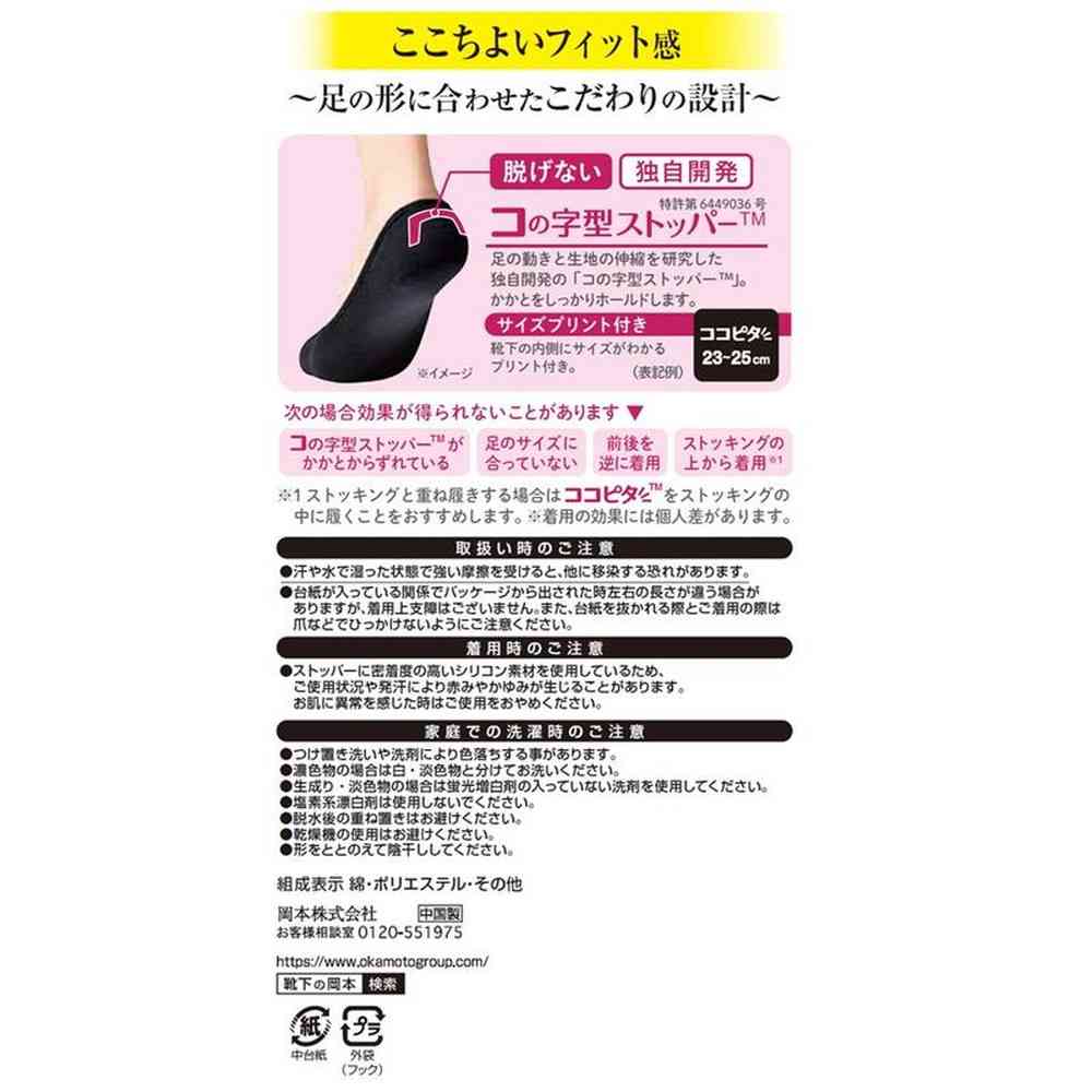 【一日中、脱げない】 足の動きと生地の伸縮を研究した独自開発・特許技術の「コの字型ストッパー?」がかかとをしっかりホールドし、「一日中、脱げない」を実現。階段を上っている時も、走っている時も、靴を脱ぐ時も、脱げません。 【靴から見せない絶妙設計】 靴から靴下が見えないので、足もとをスッキリ見せ、コーディネートの邪魔をしません。 【ココピタの履き方】 コの字型ストッパーがかかとをしっかり包むように履いてください。 かかとの生地が余らずピタッとフィットするようにしてください。