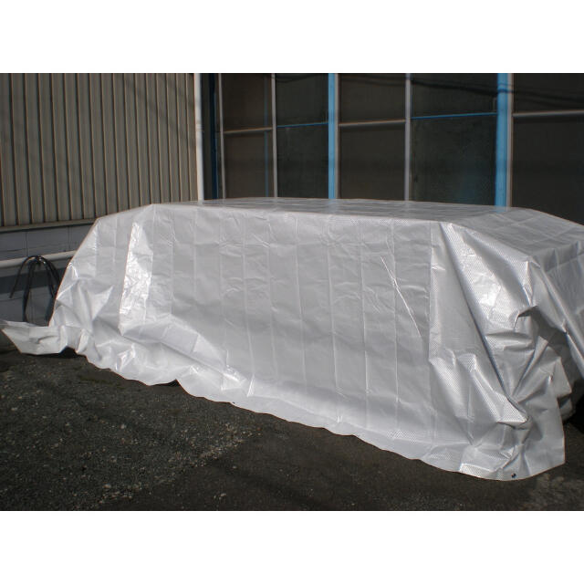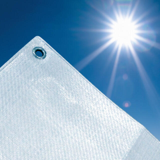 ●遮熱性と高い耐候性を兼ね備えた遮熱シートです。●太陽光の幅広い波長域で高い反射率があります。特に紫外線域、赤外線域の反射率が高いことにより、被覆した品物紫外線劣化や温度上昇防止に優れた効果があります。●温度を抑制しながら適度な光透過性も有しています。●防水性があり、屋外養生に最適です。●色:パールホワイト/ホワイト●幅(m):9.79●長さ(m):9.90●厚さ(mm):0.3●ハトメ数(個):44●ハトメピッチ(cm):90●耐久期間:5年●引張強度:縦930N/5cm、横850N/5cm●引裂強度:130N×110N●UVカット率(%):99●ハトメピッチ:30cm●可視光線透過率:9.1% 質量20.2kg