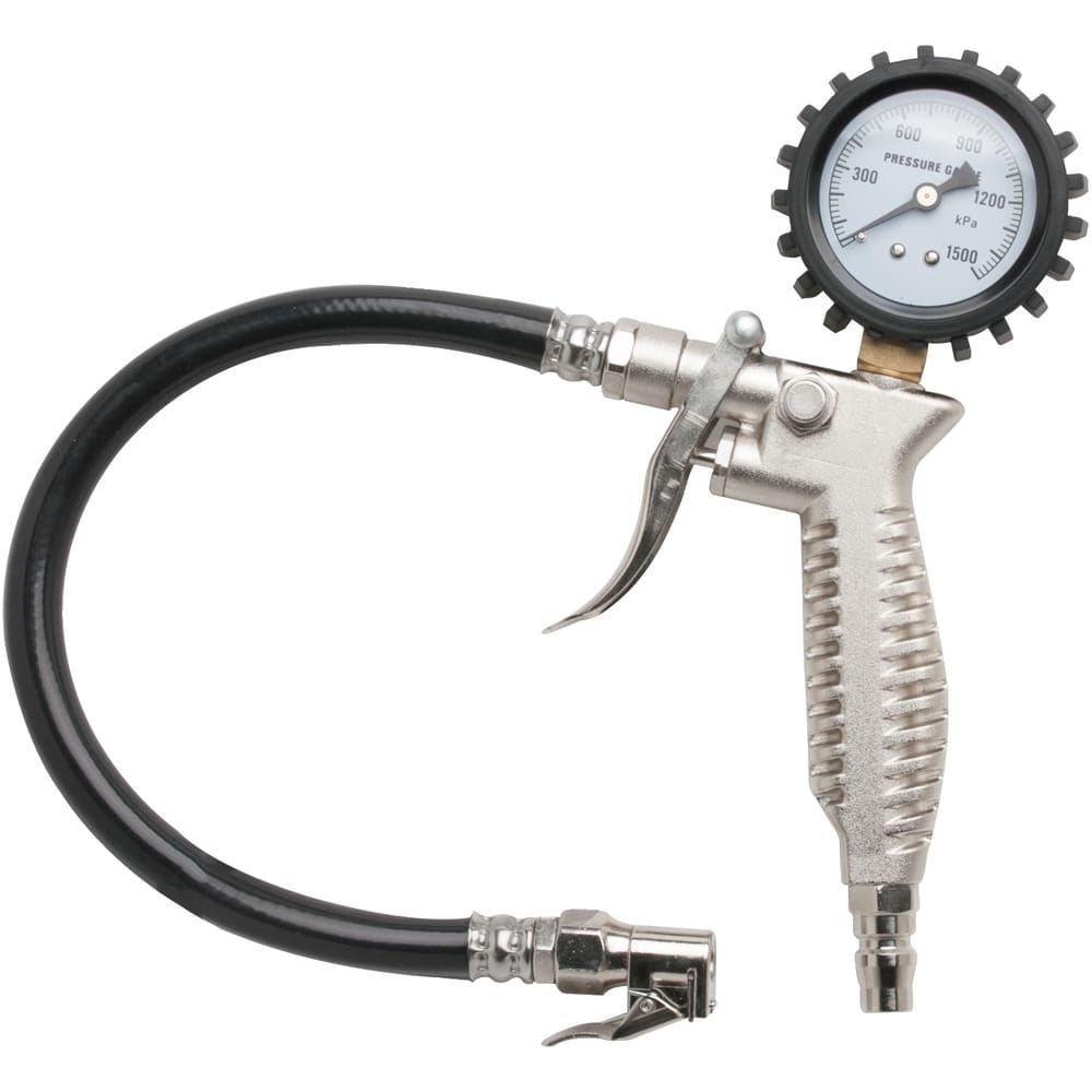●タイヤ空気圧の測定・増圧・減圧ができます。●リリースボタン付きで、空気を入れすぎた場合も簡単に空気圧を調整できます。●タイヤのバルブにはクリップチャックで接続するので、充填中にチャックを押しあてておく必要がありません。●測定範囲は1400kPaまでと幅広く、バイクからトラック・バスなど大型車まで使用することができます。●測定範囲(kPa):60~1400●最小目盛(kPa):20●全長(mm):440●幅(mm):35●高さ(mm):200●ゲージ径(mm):φ51●摘要:バイク・乗用車・バン・トラック・バス用●ホース長(mm):300●タイプ:ガンタイプ●ホース長(mm):300●測定単位:20KPa●先端形状:クリップチャック(米式タイプ) 質量340.000g