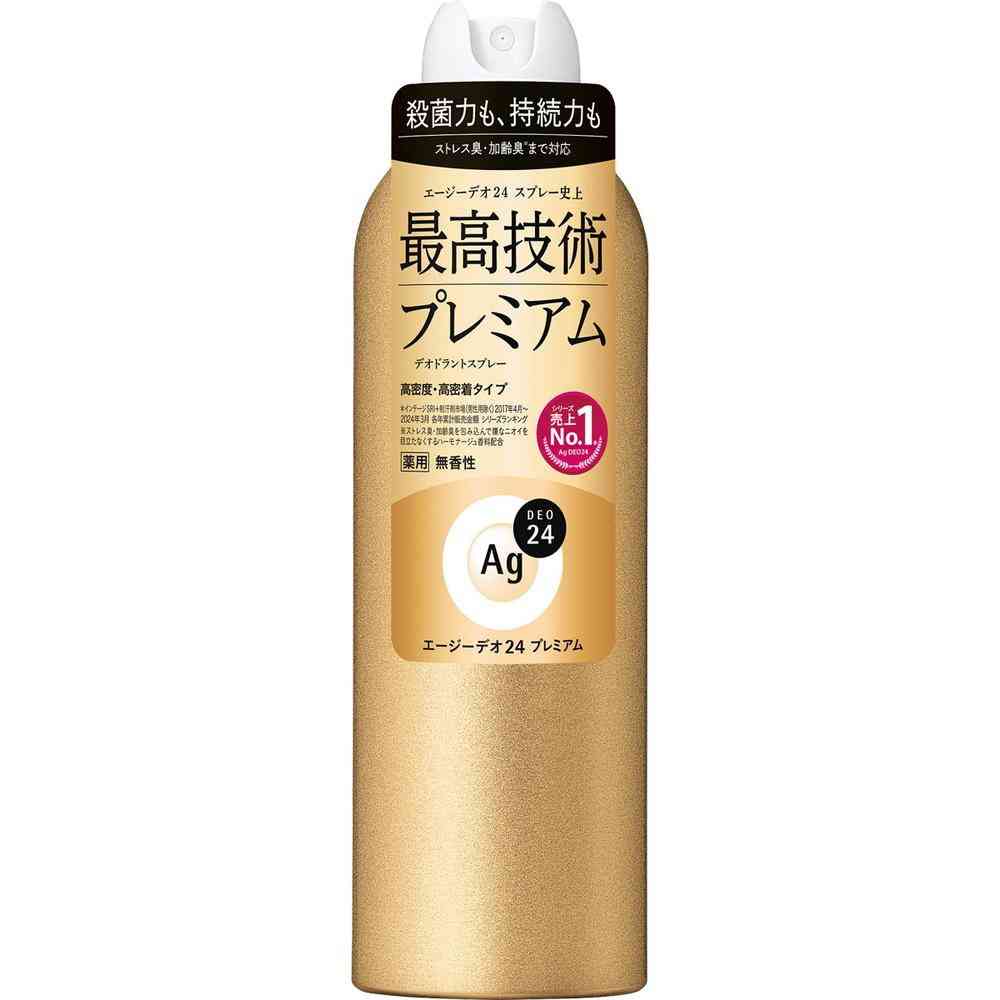 エージーデオ24パウダースプレー史上最高技術、プレミアムデオドラントスプレー。 3種のニオイ(汗臭・加齢臭※・ストレス臭※)をケア。 汗・皮脂対応。高密度・高密着タイプ。 有効成分イソプロピルメチルフェノールSP複合体配合。 ※加齢臭やストレス臭を包み込んで嫌なニオイを目立たなくするハーモナージュ香料配合。 無香性 (販売名:デオドラントスプレー プレミアム fA(NF))