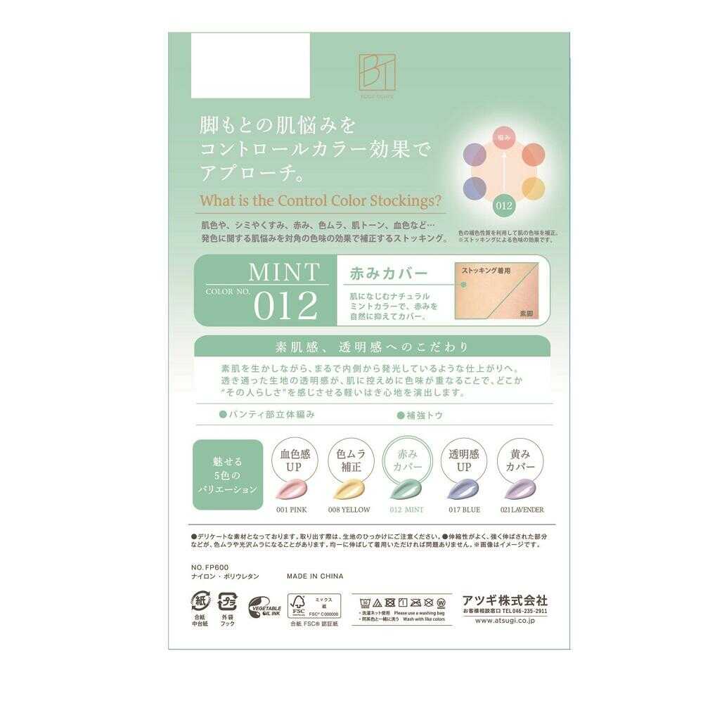 No.012ミント、赤みカバー。肌の気になる赤みを抑えたい人にオススメ。 ●脚もとの肌悩みをコントロールカラー効果でアプローチ。 ●肌色、シミやくすみ、赤み、色ムラ、肌トーン、血色など発色に関する悩みを対角の色味の効果で補正するストッキング。 ●パンティ部立体編み。 ●補強トウ。