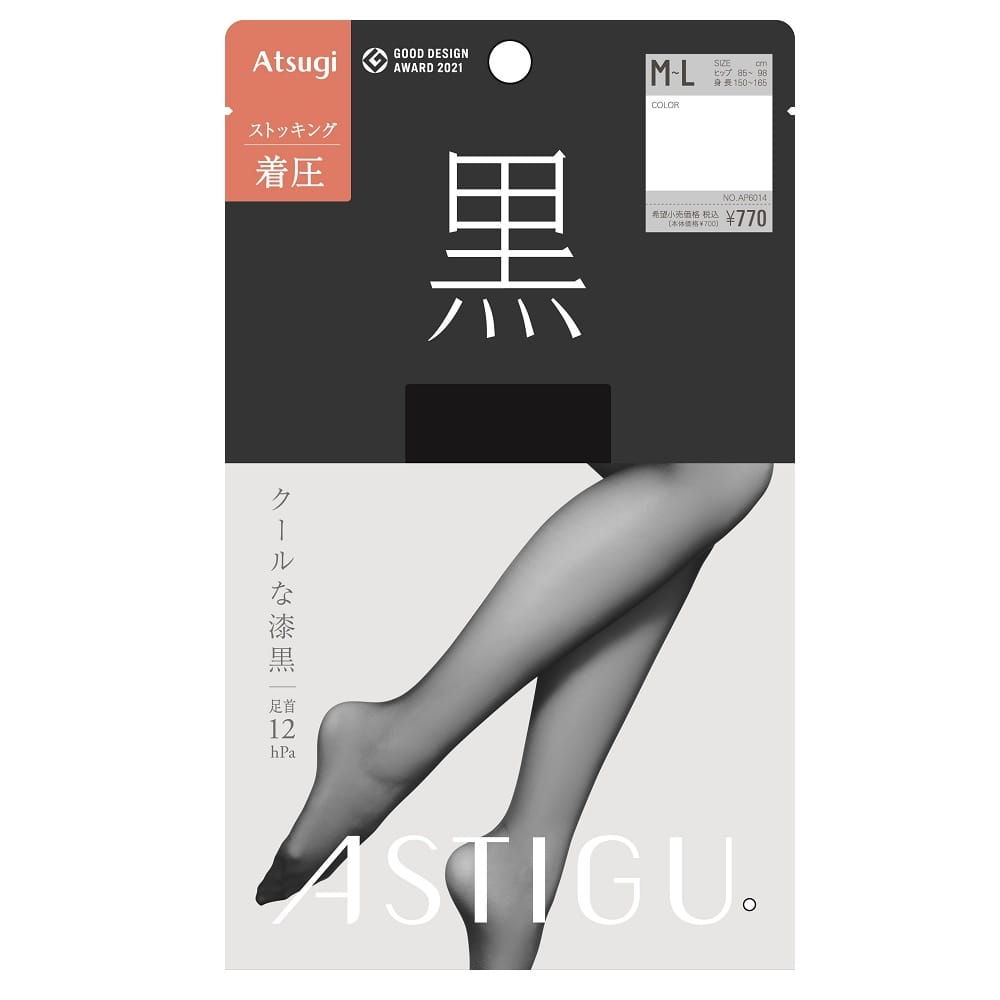 漆黒の陰影が美しい。より引き締まった印象の黒。足首12hPa着圧設計。漆黒の糸を使用し、深みのあるモードな黒を表現。パンティ部がよく伸びズレにくい。補強トウ。静電防止加工。足形セット。UV対策成分配合。オリジナルバックマーク付。