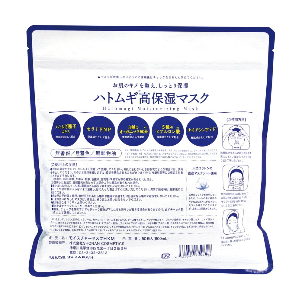 国産ハトムギ種子エキス・セラミド・3種のオーガニック成分配合! 無香料・無着色・無鉱物油・天然コットン使用のお肌にやさしい高保湿マスクです。