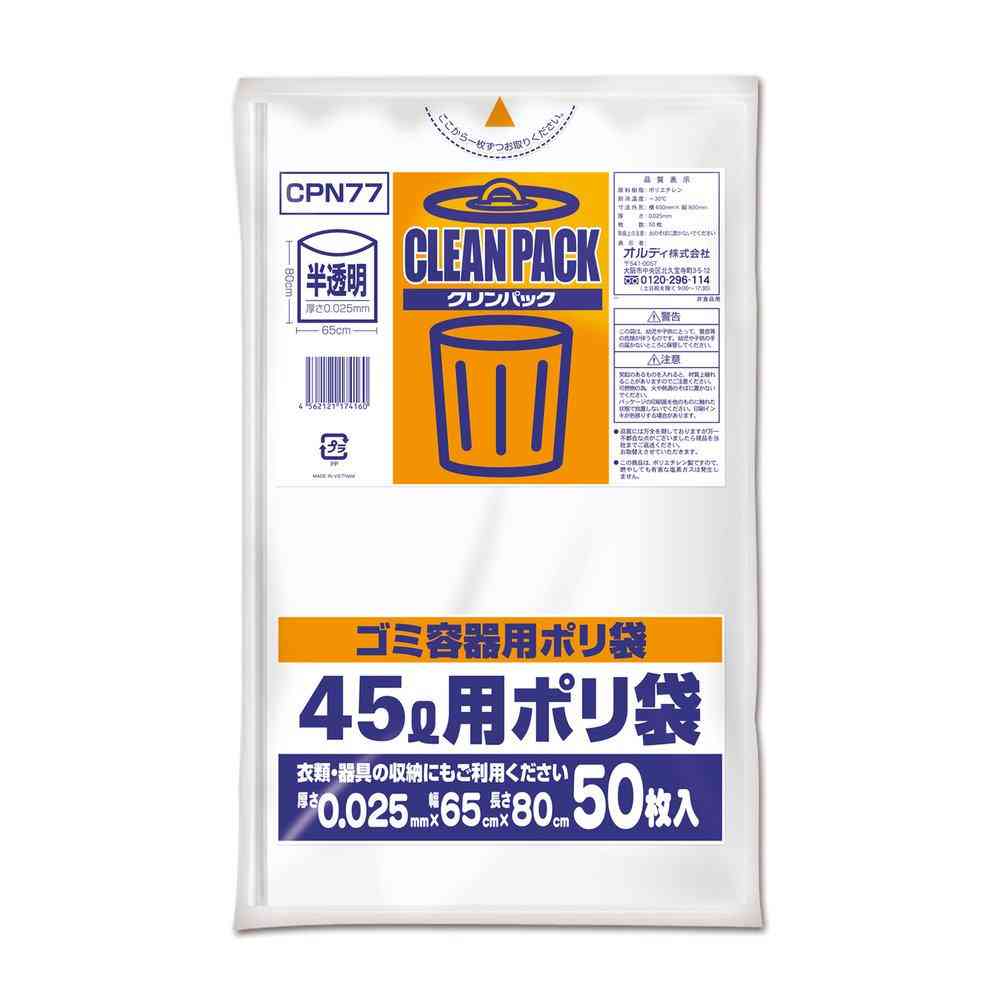 厚さ0.025mm、50枚入り増量タイプ。 丈夫で柔軟性のある低密度ポリエチレン製、乳白半透明ポリ袋 【容量】45L