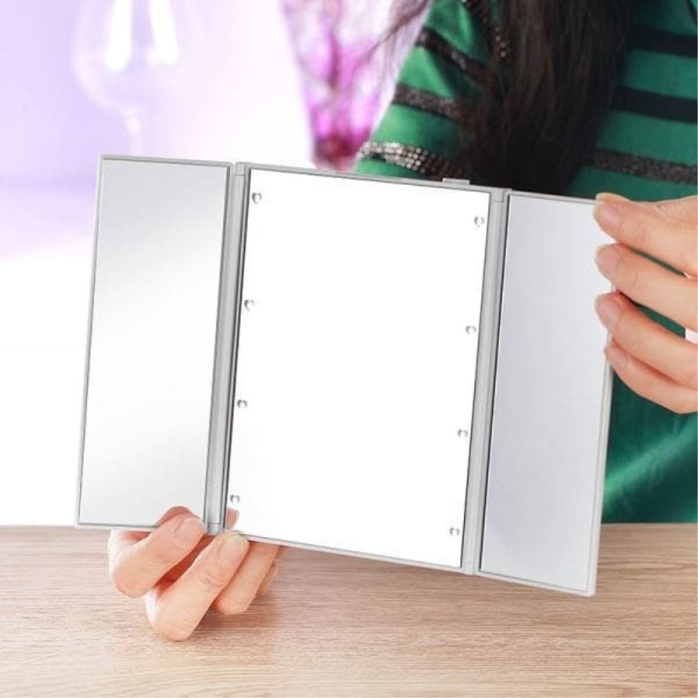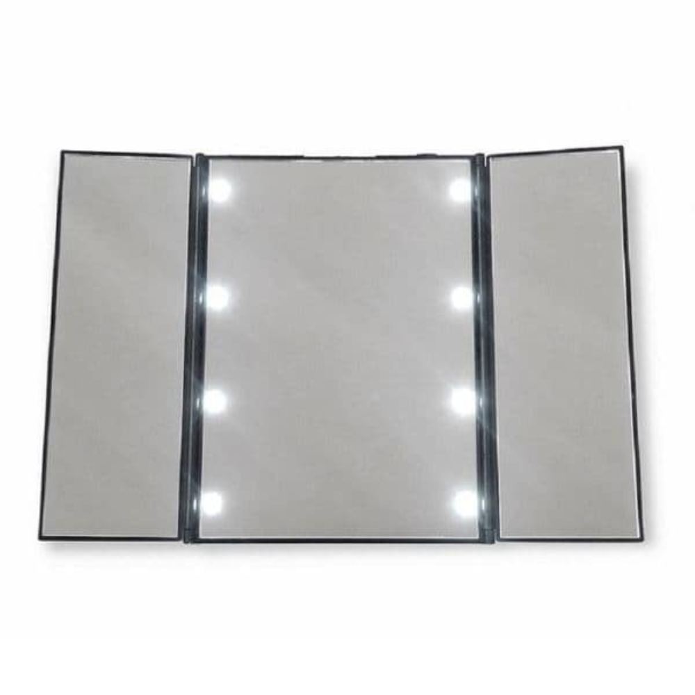 ハートの形の8つのLEDライトが均等に顔を照らします!スタンドの角度は90°にまで無段階で自在に変えられるのでお好みの角度でご使用いただけます。折りたたみ式のコンパクトなサイズでバッグに入れやすいのがうれしいポイント!観音開きの三面鏡なので汚れにくく、旅行先やお出かけなどの持ち運びにオススメです。