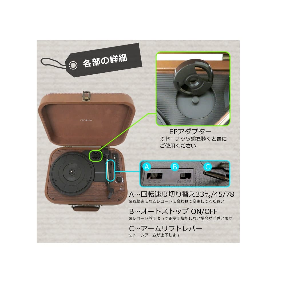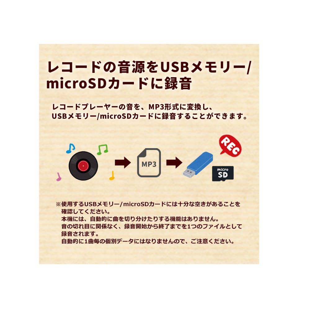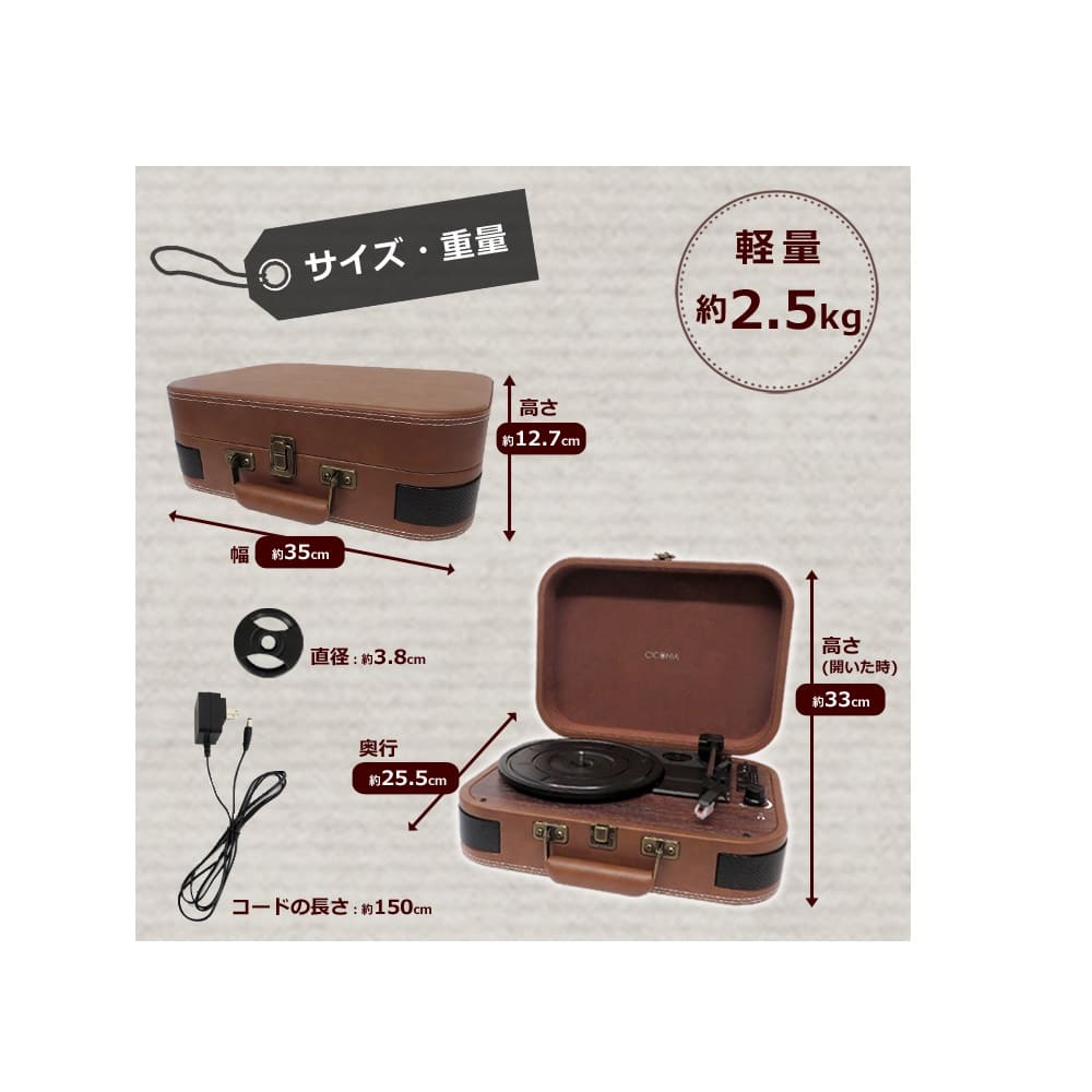思い出の名盤が蘇る。 ●レトロな外観でも、機能は充実。気軽に聴けるのでレコードデビューに!●レトロなトランクケース型で部屋の隅に置いても、オシャレ。●使わない時はフタを閉めておけば、埃も入りません。●バッテリー内蔵で屋外でも使える!●331/3、45、78回転に対応。クリアな音質でレコードを楽しめます。●EPアダプターも付属●最後の曲が終了すると自動でターンテーブルの回転がストップする、オートストップ機能搭載●USBメモリー/microSDカードから再生/録音可能●Bluetooth接続可能●FMアンテナ付き 【仕様】 ●寸法:350×127(開いた時:330)×255mm●質量:2.5kg●コード長さ:150cm●定格出力:5W×2●バッテリー:3.7V、2000mAh●充電時間:約4時間●連続使用時間:約6~8時間●入力端子:AUX-IN(3.5mm径ミニプラグ)、AC/DCアダプター接続端子、USB/microSDカード端子●出力端子:RCA端子(右:赤、左:白)、ヘッドホン端子(3.5mm径ミニプラグ)●付属品:EPアダプター、AC/DCアダプター(本機専用)、取扱説明書