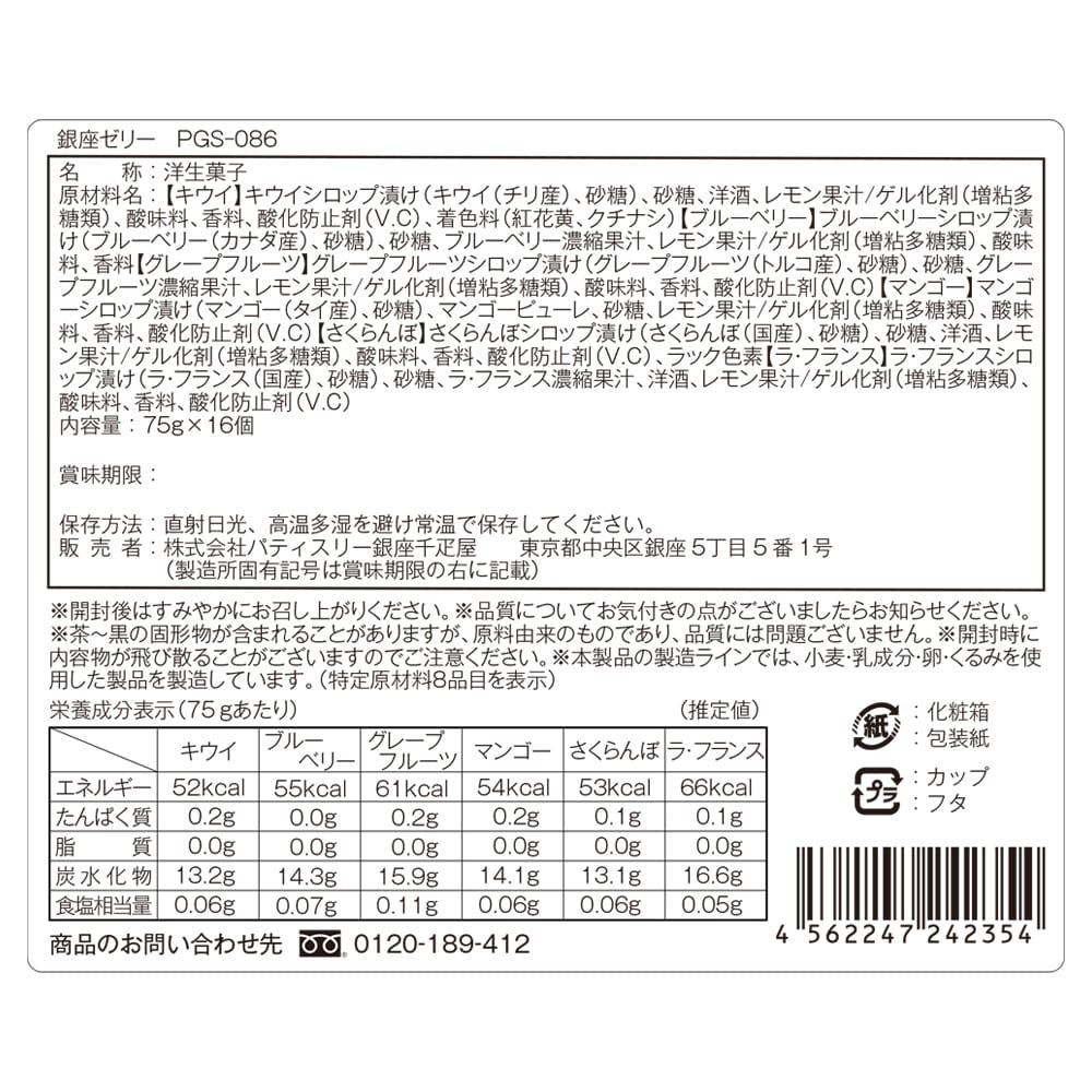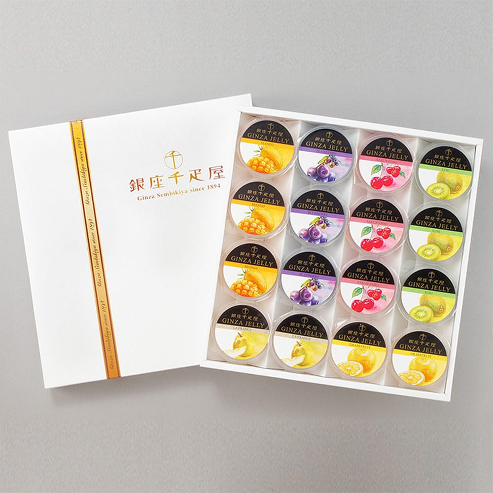 果物の味をそのまま生かし、上品でフルーティな香りと優しい甘みに仕上げた、銀座千疋屋オリジナルのフルーツゼリーの詰め合わせです。 ●内容量マンゴー、キウイ、ブルーベリー、さくらんぼ各75g×各3個、グレープフルーツ、ラ・フランス各75g×各2個/ 計16個 ●賞味期限常温300日