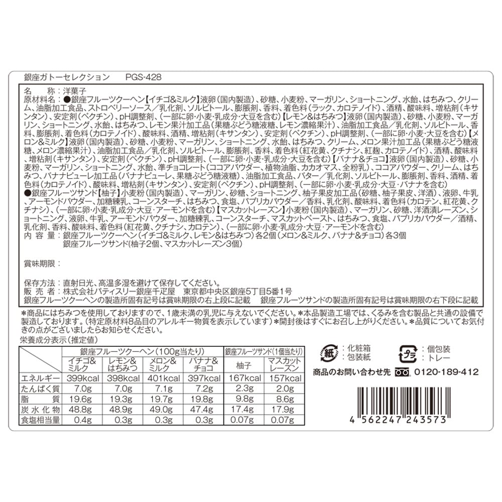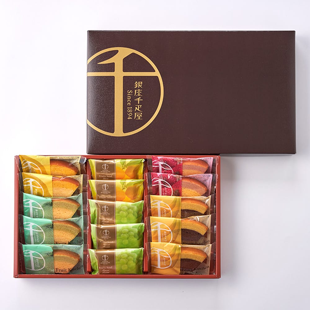 一層一層丁寧に焼き上げた生地と、果汁を加えて仕上げた生地の2つの味が絶妙なハーモニーの「フルーツクーヘン」。なめらかで口当たりのやさしいフルーツクリームと香り豊かな果肉を香ばしいクッキーでサンドした「フルーツサンド」の詰合せです。 ●内容量銀座フルーツクーヘン(いちご&ミルク・レモン&はちみつ 各2個、メロン&ミルク・バナナ&チョコ 各3個)、銀座フルーツサンド(柚子 2個、マスカットレーズン 3個) ●賞味期限常温120日