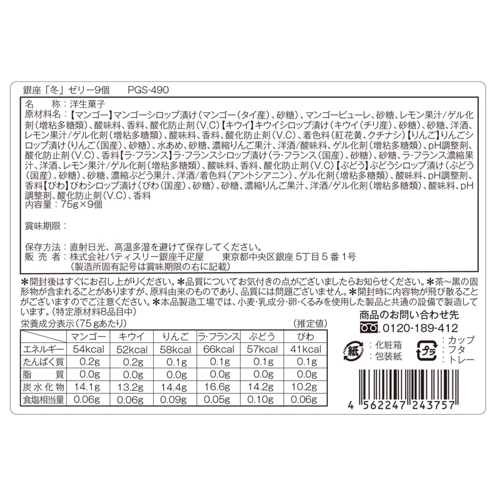 果物の味をそのまま生かし、上品でフルーティな香りと優しい甘みに仕上げた、銀座千疋屋オリジナルのフルーツゼリーの詰め合わせです。 ●内容量マンゴー・キウイ・りんご・各75g×2個、ラフランス・ぶどう・びわ各75g×各1個 ●賞味期限常温300日