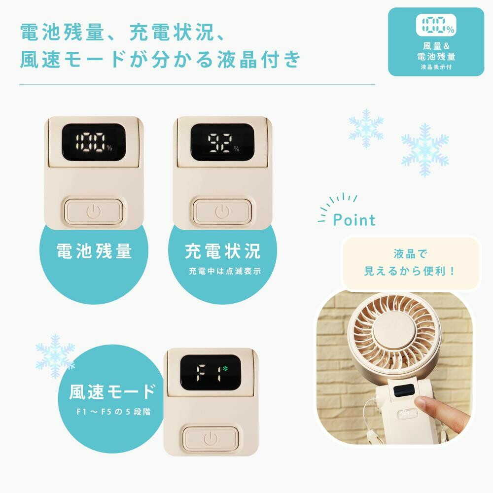 ●ICEプレートでおでこや首元を冷やして使用ができる ●4000mAhバッテリー搭載、長時間使えて外出時も安心 ●電池残量、充電状況、風速モードが分かる液晶付き ●ボタンを押すごとに風速5段階調整が可能 ●手前と奥の両方に折りたためる設計で、卓上使用でもボタン操作ができる ●取り外し可能なネックストラップ付 ●USB-A toType-C充電ケーブル、ストラップ、取扱説明書