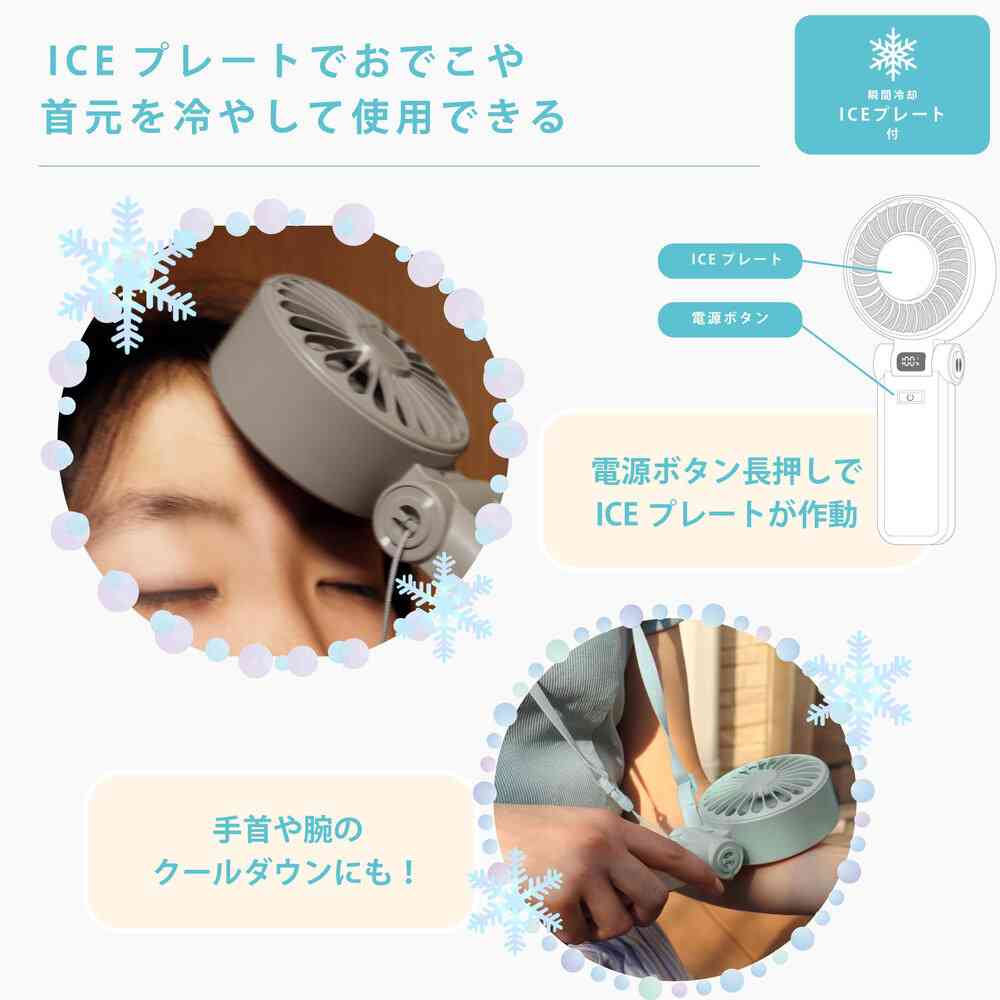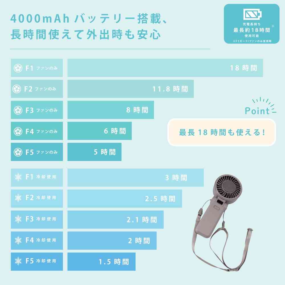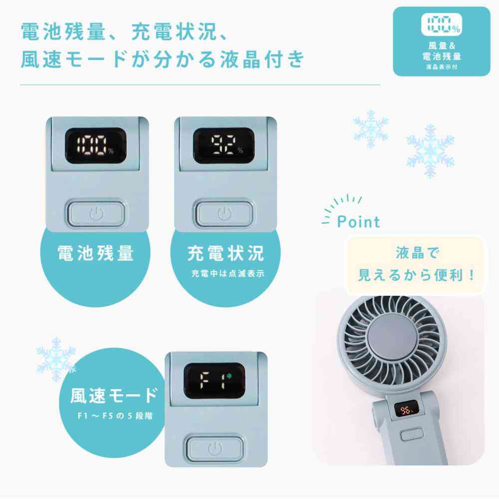 ○ICEプレートでおでこや首元を冷やして使用できる ○電池残量、充電状況、風速モードが分かる液晶付き ○4000mAhバッテリー搭載、長時間使えて外出時も安心 ○ボタンを押すごとに風速5段階調整が可能 ○手前と奥の両方に折りたためる設計で、デスクにも置ける ○取り外し可能なネックストラップ付 USB-A toType-C充電ケーブル、ストラップ、取扱説明書