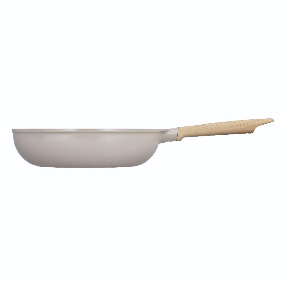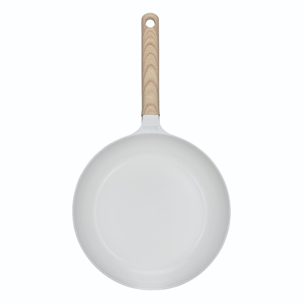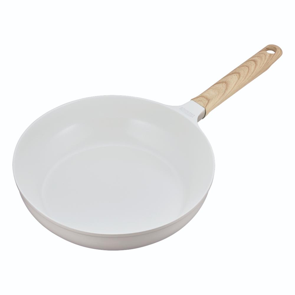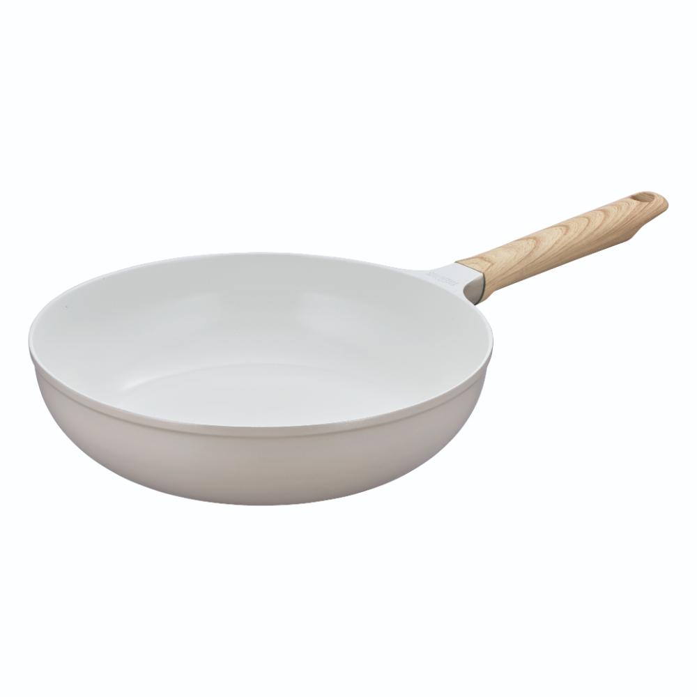 ダイキャスト製法だから軽量!見た目も機能性もこだわったフライパン 高耐久性セラプロテクトコート採用 ダイキャスト製法でIH対応でも軽量 内面が白くて、食材の色等を確認しやすい 留め具がないから洗いやすい 優しい色味の木目調ハンドル 卵2つでちょうどよいサイズ感