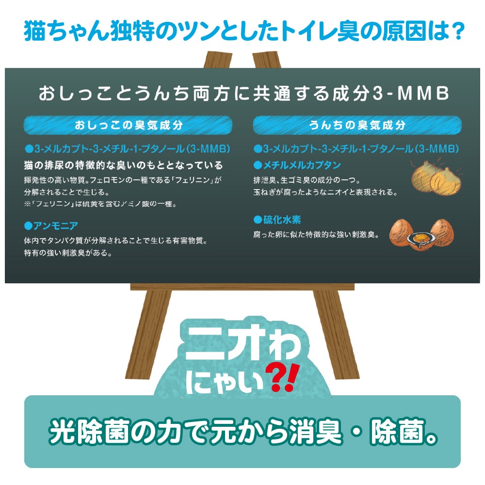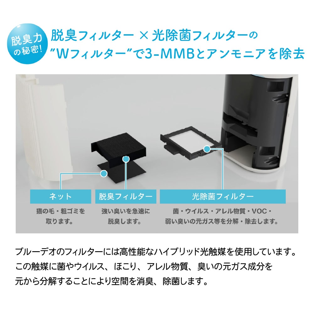 猫のトイレ臭を徹底除去。猫想いの脱臭除菌機 ●猫の糞尿臭に含まれる成分「3-MMB」や「アンモニア」等を光除菌技術で徹底除去。●トイレ横に置くだけで、ツンとした臭いを強力に除去し、いつも清潔な空間に。●猫想い4つの特徴。1:猫にやさしい「光除菌方式」。猫への影響にも配慮した、化学物質を放出しない方式です。2:驚かせない静音設計。モーターの回転をゆるやかに上げ、音に敏感な猫もリラックス。3:噛みに強い電源コード。丈夫なPVC編み込み仕様で、断線リスクを軽減。4:猫が落ち着くグレーカラー。●猫トイレのそばにも置けるコンパクトサイズなのに、室内臭も10畳までしっかり脱臭。●5年間フィルター交換不要。光除菌フィルター+脱臭フィルターで脱臭力長持ち。 【仕様】 ●製品寸法:W206×D140×H289mm●重量:約1.6kg●推奨床面積:約10畳●消費電力:弱/11W、標準/11.5W、ターボ/18W●運転音:弱/21dB、標準/25dB、ターボ/48dB●風量:弱/0.10m3/min、標準/0.24m3/min、ターボ/0.70m3/min●コード:約1.5m●付属品:ACアダプター