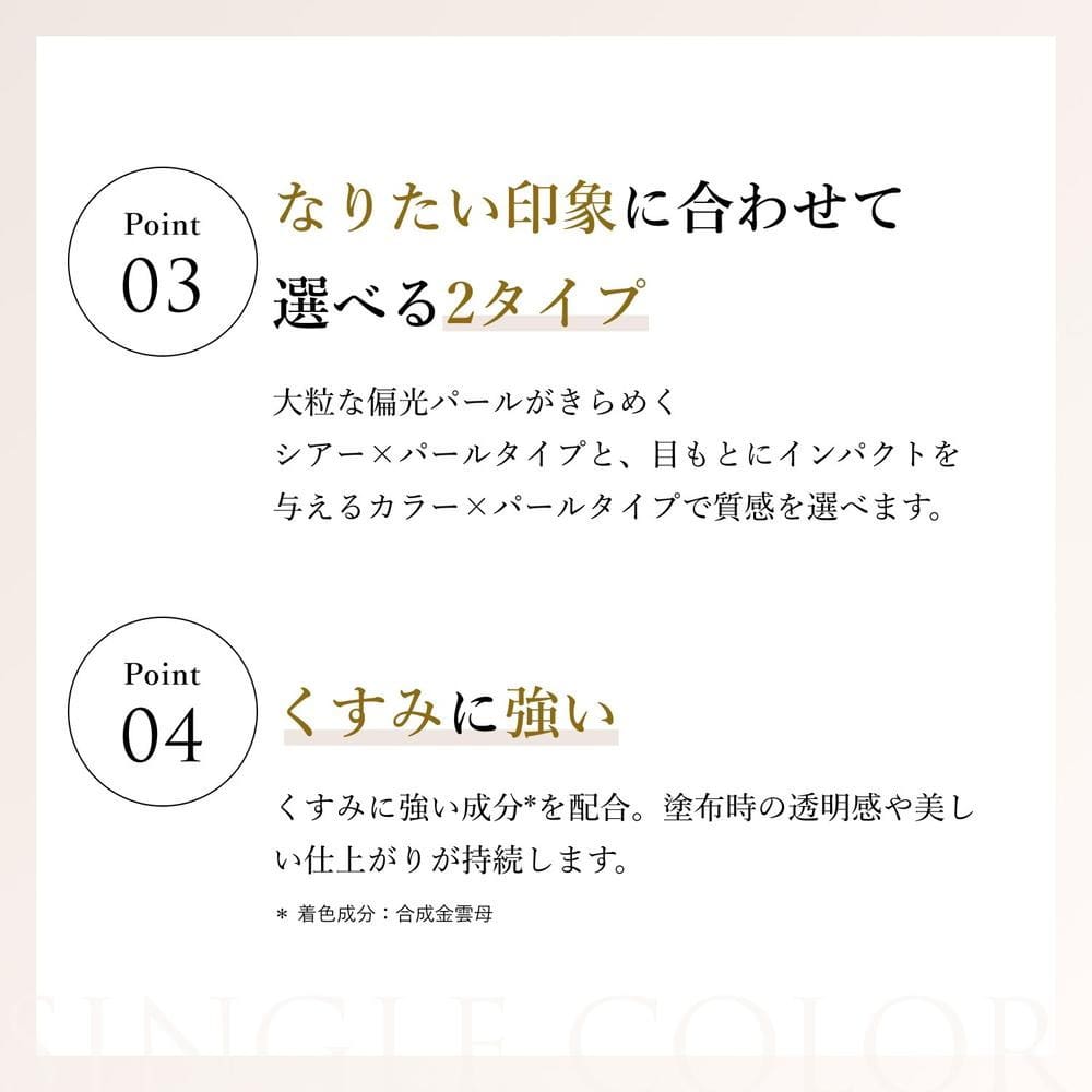 いつものメイクにキラキラをオン! たまには挑戦メイクで攻めた自分も。いつでもリッチで魅惑的な目もとに。 ブラウン系濃ブラウンベースに偏光パールがきらめくカラー ビターチョコレートのようにこっくり深いブラウンのベースにピンク、レッド、ゴールドに輝くパールがあたたかく煌めきます。 色を濃淡でグラデーションにすると映える目もとに。 お手持ちのアイシャドウと合わせて、目の際の締め色としての使用もおすすめのカラーです。