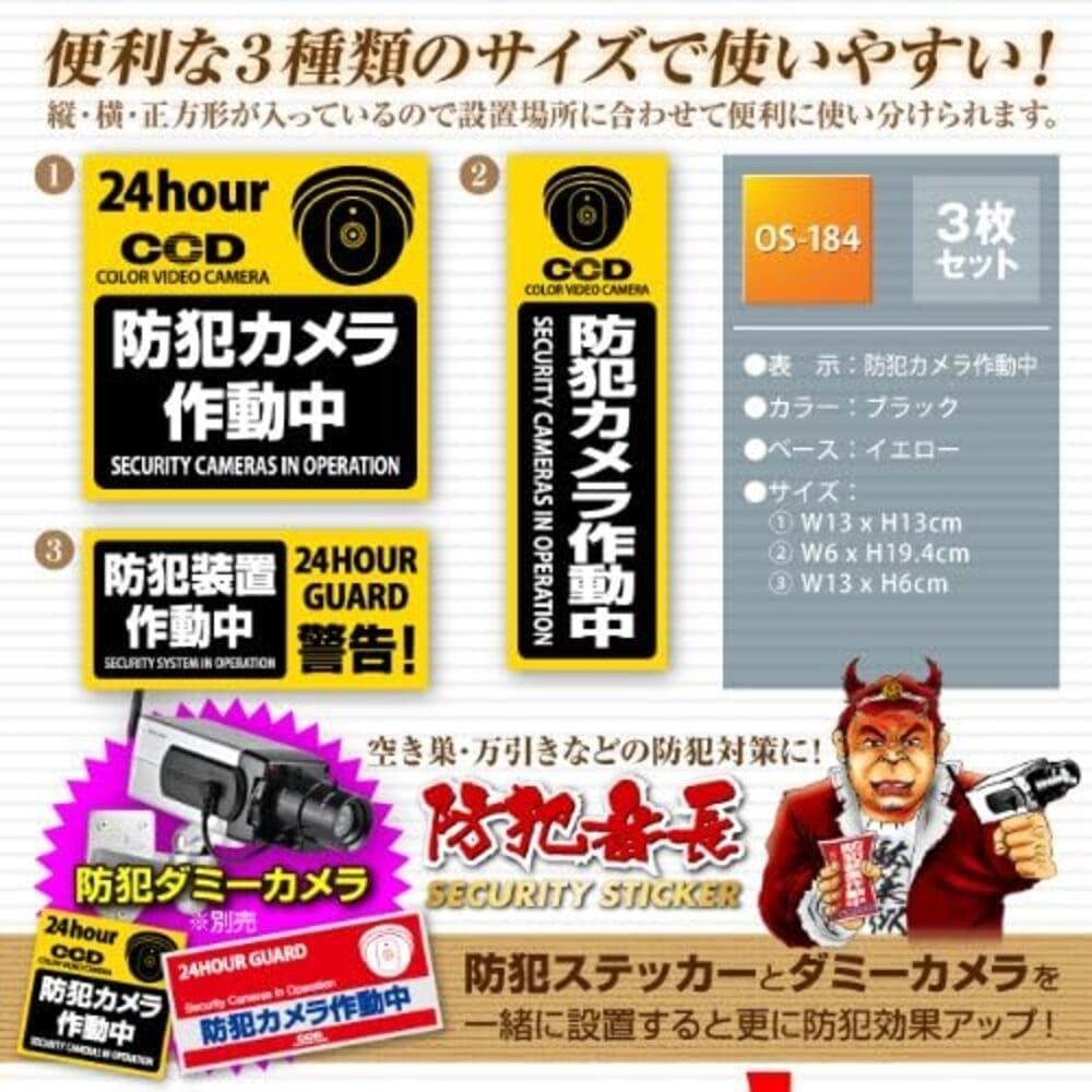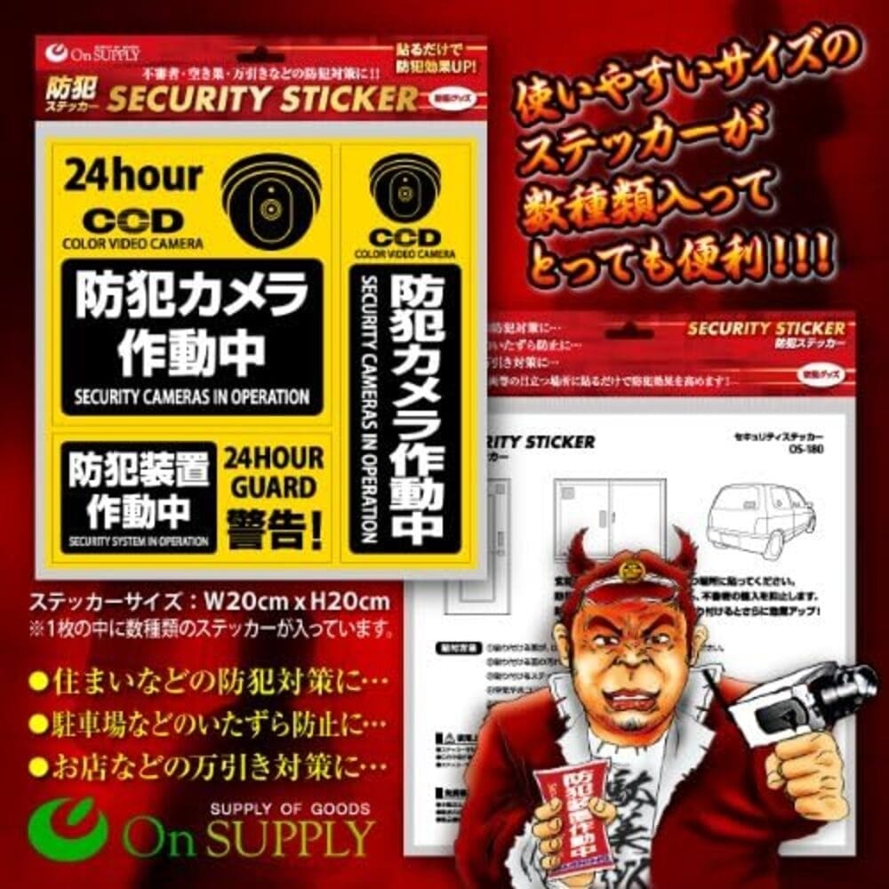 ●セキュリティーステッカーの利点・効果 1)低コストでだれでも貼れる簡単シール 2)防犯意識の高さをアピール、必然的に防犯効果が高まります。 3)防犯装置が設置されていなくても侵入者の威嚇効果があります。 4)防犯装置を実際に設置されている場所では、更なる意欲撃退効果。 5)防犯ダミーカメラ等と一緒にご使用されると更に効果的です。