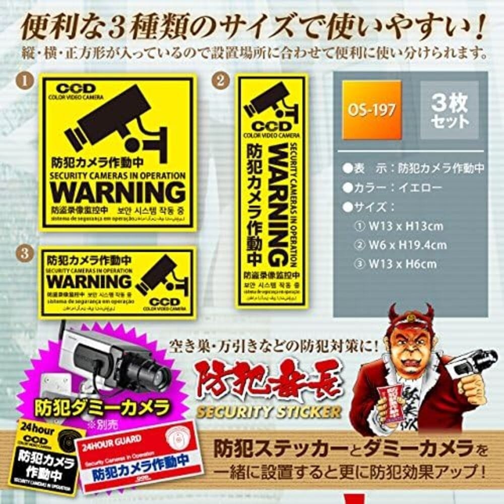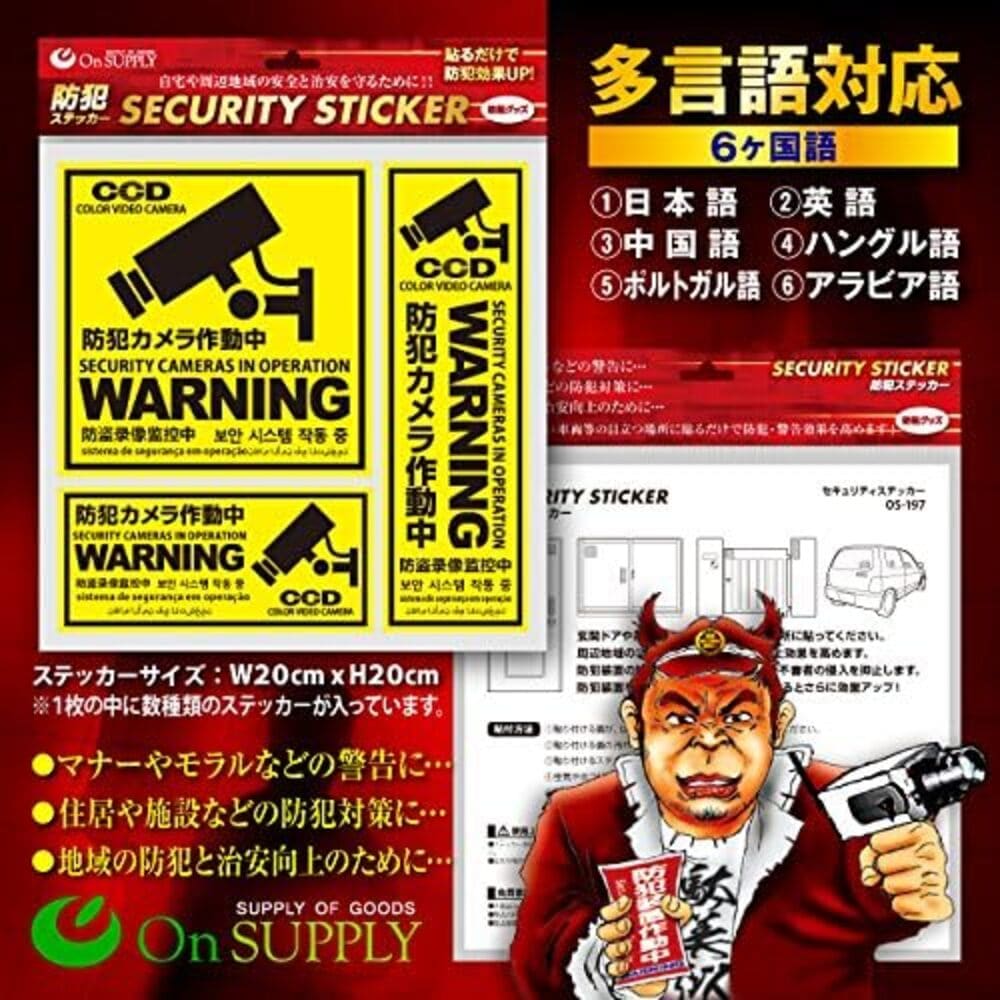 ●セキュリティーステッカーの利点・効果 1)低コストでだれでも貼れる簡単シール 2)防犯意識の高さをアピール、必然的に防犯効果が高まります。 3)防犯装置が設置されていなくても侵入者の威嚇効果があります。 4)防犯装置を実際に設置されている場所では、更なる意欲撃退効果。 5)防犯ダミーカメラ等と一緒にご使用されると更に効果的です。