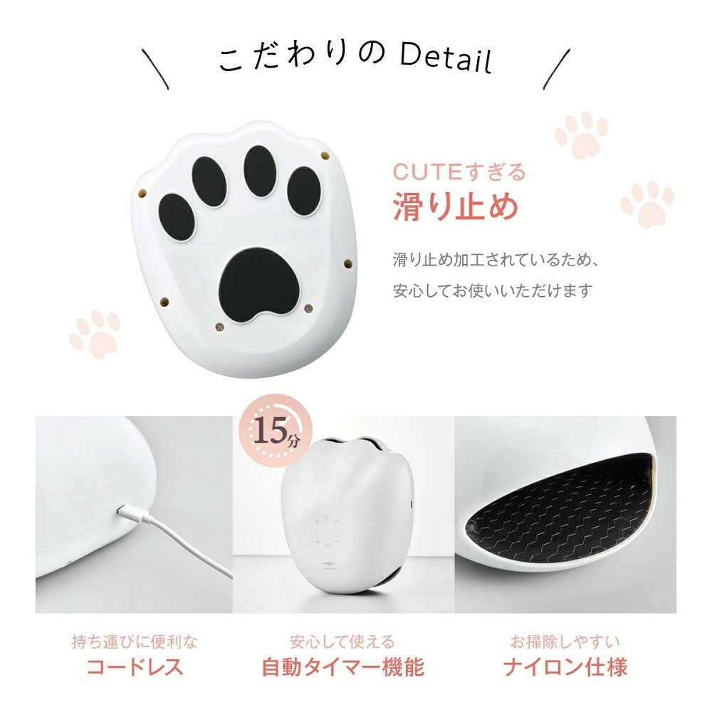 可愛らしいアニマル柄に気持ち癒される「EMS Hand Esthe」。 EMS×温熱×エアプレスで手全体を包み込んでほぐしてくれるだけでなく、年齢の出やすいハンドへのお手軽な美容ケアとしても。 手の深くまで伝わる低周波のリズムに、短時間のケアでも心身ともにリフレッシュできる『EMS機能』(10段階の強度レベルあり)。 手の甲の中心部分を起点に低周波の刺激が先端まで走り、指ケアにも。自信みなぎる艶感ハンドへ導きます。 3段階の温熱レベルからお好みで選べ、ハンドクリームを塗り密閉した状態で温めると潤いがキープされ、しっとりとした手元になります。 まるで人の手でもみほぐすような感覚の『エアプレス機能』は、上下からエアバッグに包まれ、やみつきの心地よさ。 エアバッグを膨らませたりしぼませたりすることで加圧し、手のひらや裏、全体を順番にしっかりと押していきます。 持ち運びに便利なコードレス、安心して使える自動タイマー機能、お掃除しやすいナイロン仕様、肉球デザインストッパーなど使うほどに愛着が沸くディテールも! どなたでもフィットするサイズ感に、男性女性関係なく、安心してお使いいただけます。