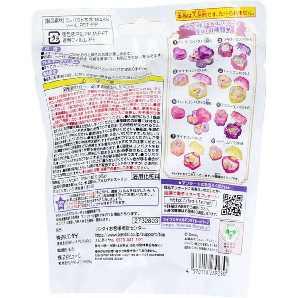 「ラプンツェル」のびっくらたまごが登場!入浴剤が溶けると、中からコンパクトが1つ出てきます。 コンパクトはクリア・ラメ入りでキラキラ!開閉やスライドのできるギミック付きコンパクトです。 スイートグレープのかおりと、紫色のお湯が楽しめます。 お肌しっとり。 乾燥を防ぎ、皮膚を清浄にし、お肌にうるおいを与えます。 アレルギーテスト済み。 ※すべての人にアレルギーが起きないというわけではありません。 中から出てくるコンパクトは全部で8種類。 ※いずれか1つが入っています。 ※コンパクトの種類は選べません。