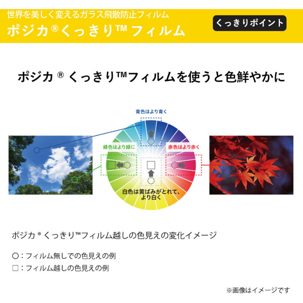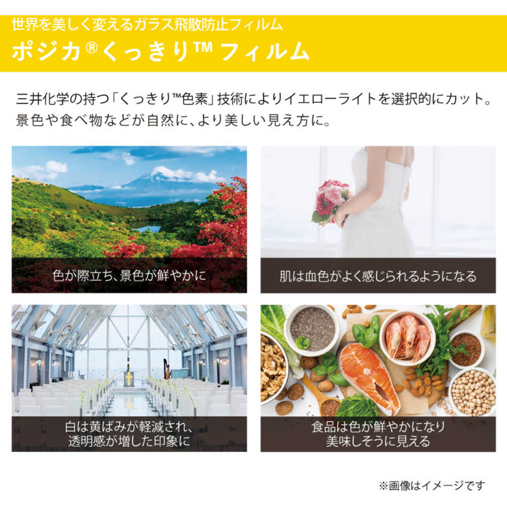 ●三井化学の「くっきり色素」技術を用いイエローライトを選択的にカットすることで、フィルム越しに見える景色を、自然な見え方ながら色鮮やかに見せるポリエステルベースのウインドウフィルムです。●災害時におけるガラスの飛散を防止し周囲の安全を確保します。(JIS A 5759適合)●紫外線を99%カットし、日焼けやインテリアの退色を抑制します。●表面のハードコート層により施工時や施工後の傷付きを軽減します。●国土交通大臣認定 不燃材料 認定番号 NM-3742取得しています。●色:淡色●幅(m):1.55●長さ(m):2●日射透過率:79.4%●日射反射率:7.6%●日射吸収率:13.0%●可視光線透過率:81.0%●可視光線反射率:7.5%●紫外線透過率:<1%●585nm(イエローライトの波長領域)分光透過率:61.5%●上記は実測値であり、保証値ではございません。●耐用年数:約10年(参考値であり、保証するものではございません) 質量420g