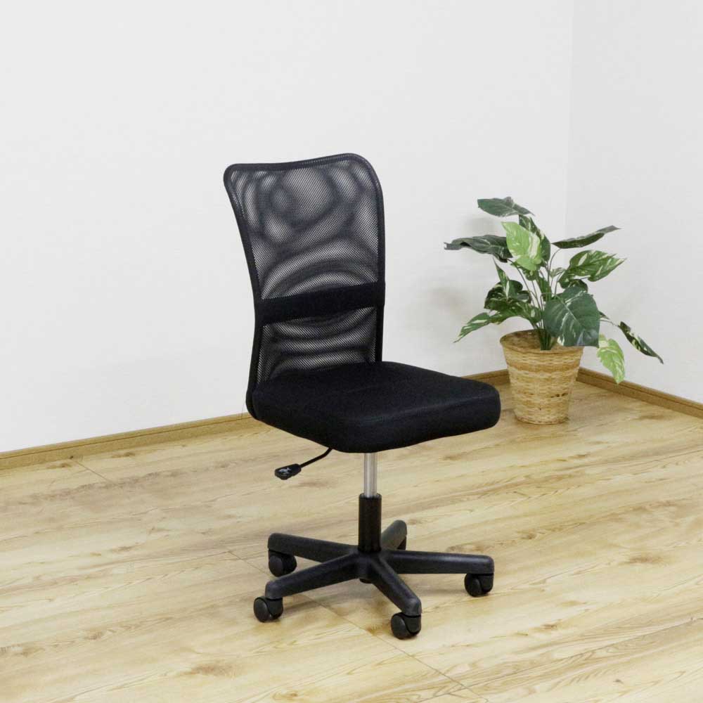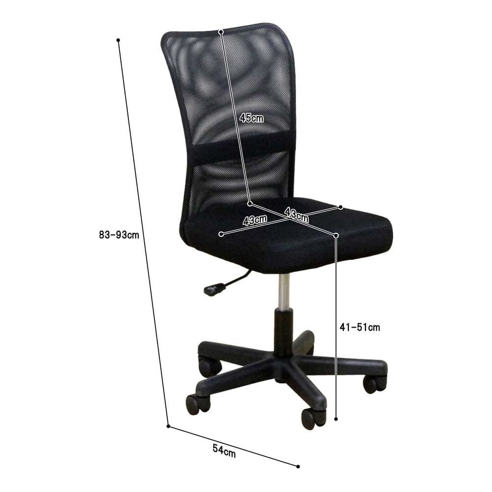 ●コンパクトですが、座面も厚く掛け心地の良いオフィスチェアー。●メッシュ生地で通気性も抜群。●座面は昇降式で高さ調整可能。●座面高:45-55cm。●カラー:ブラック色。●生産国:中国。