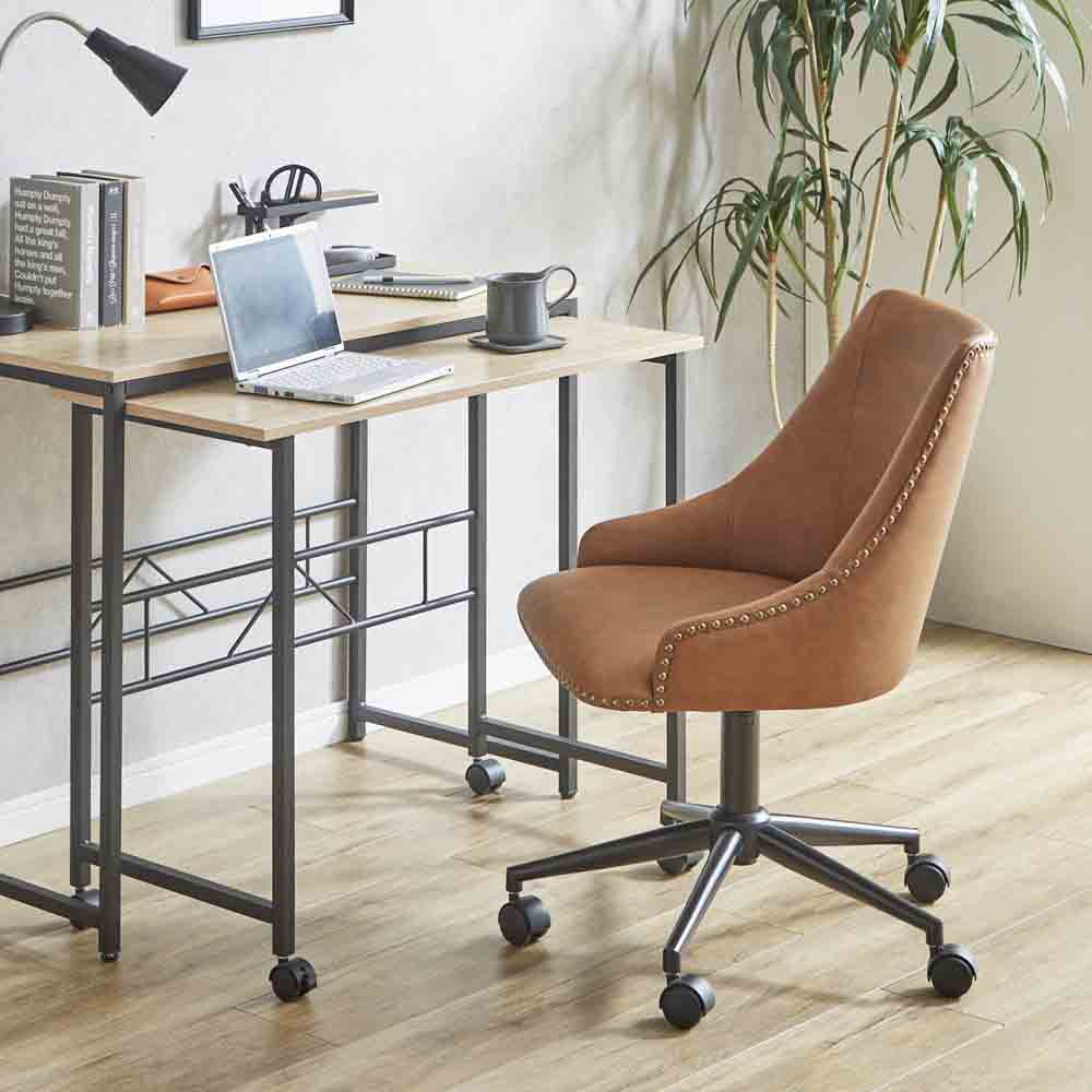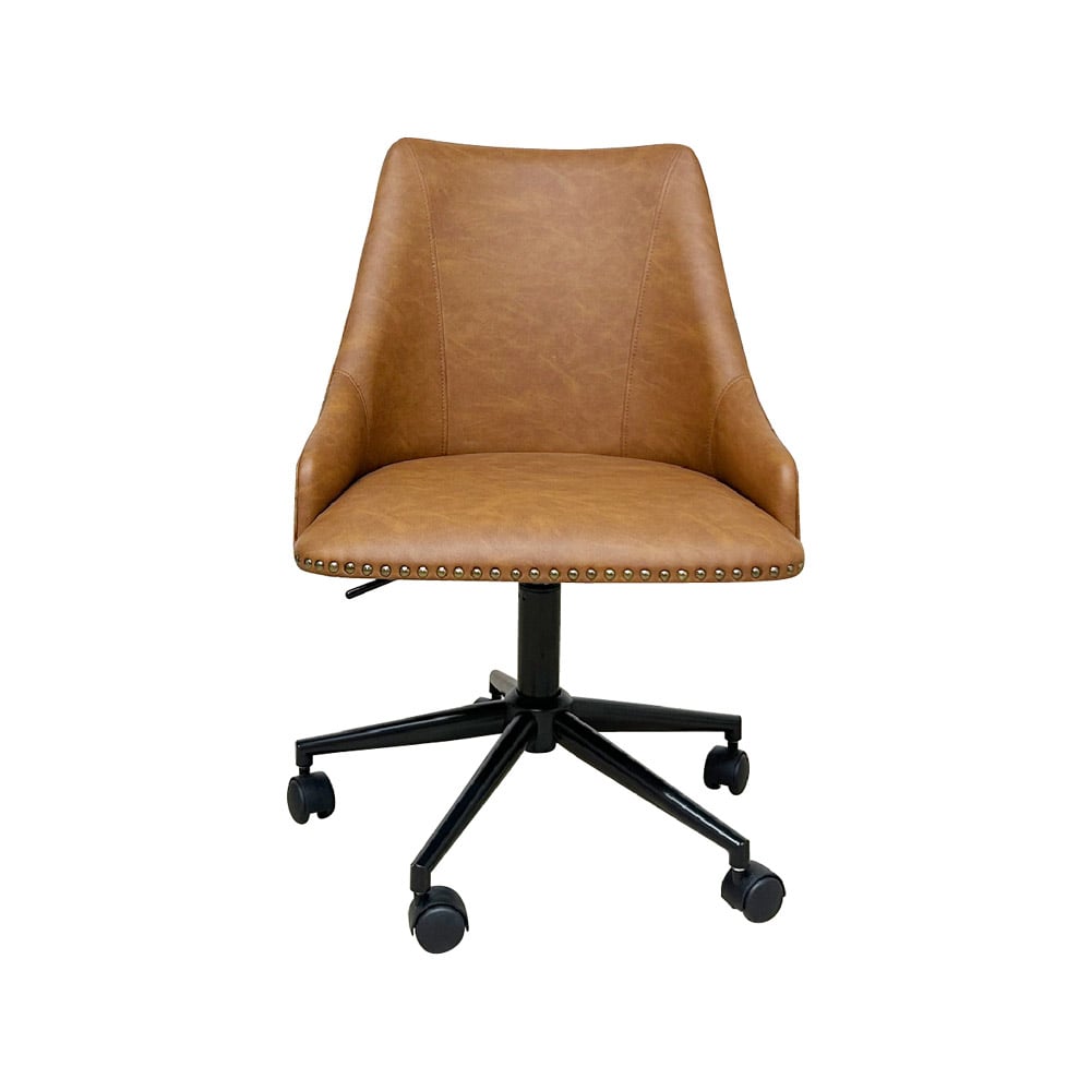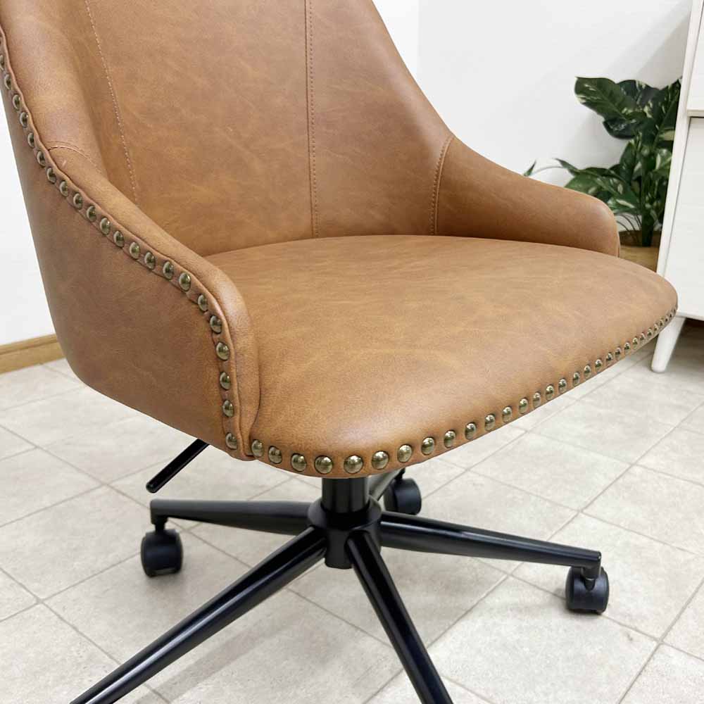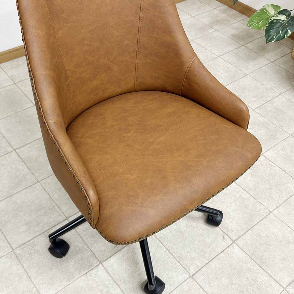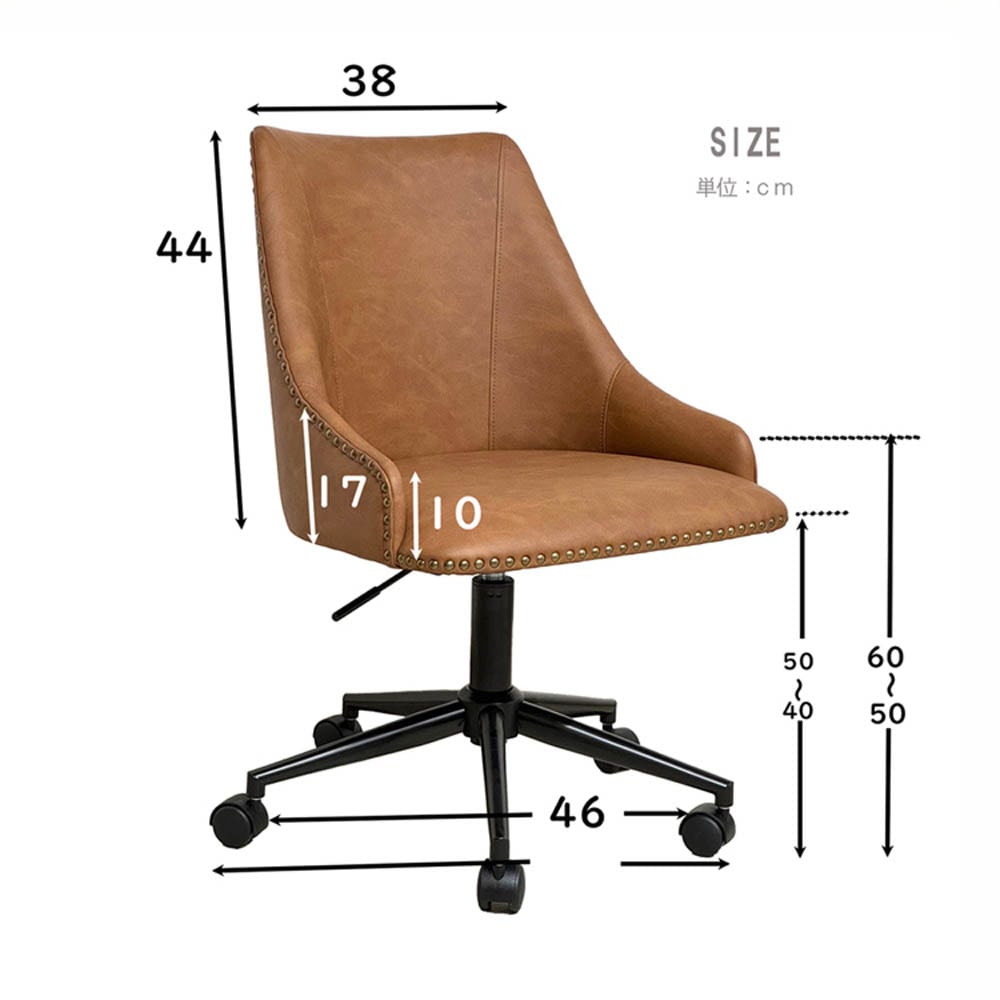 ●鋲締めがミッドセンチュリー期を彷彿させるモダンデザインのワークチェアー。●座面はガス圧昇降式でお好みの高さへ調整可能。座面は360°スムーズに回転しますので、壁際などスペースの限られた場所でも立ち座りのしやすい、快適設計。●カラー:ライトブラウン色。