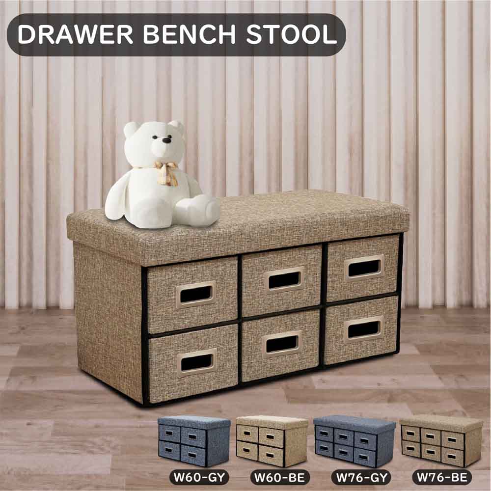 ●耐荷重80kgクリアした大容量の収納+踏み台+ベンチとしてもご利用可能な一石三鳥の便利なアイテム。●組立金具が一切ない楽組仕様で女性の方でも楽々組立可能。●幅76cmのベンチスツールは6杯引出しで大容量の収納可能。