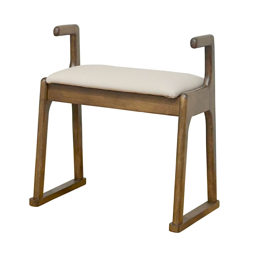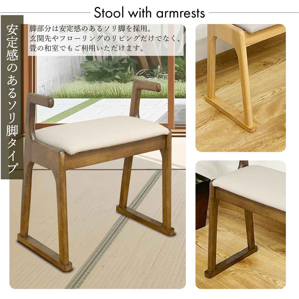立ち上がりやすい肘掛グリップ付きスツール!ブラウン色!●立ち上がりやすい肘付で丸のない柔らかなデザイン。●木部は北欧インテリアに使われるビーチ材を採用、木目が少なくどんなインテリアにも調和しやすいのが特徴的。●座面分はクッション性の高いウレタンフォーム入り。●汚れてもお手入れそやすいPVC生地で汚れてもサッと拭けてお手入れ楽々。●ソリ脚タイプなので畳のお部屋でもご利用可能。