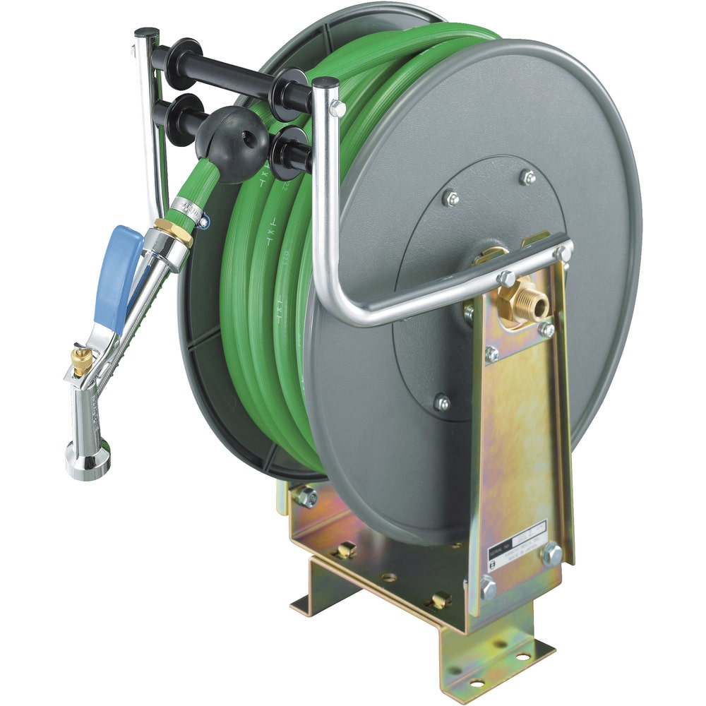 ●樹脂ドラムで軽量かつスムーズな引き出しトルクです。●キリ・ストレートの切替え可能なメタル製散水ノズル付きです。●天吊り・壁付け・床置きの3通りの設置が可能で、使用後は自動巻取りで速やかに収納できます。●ホース全長(m):15●適合ホース内径(mm):12.7●適合ホース外径(mm):19●使用圧力(MPa):0.5●幅(mm):380●奥行(mm):247●高さ(mm):430●蛇口側ホース長さ(m):2.0●ホース色:グリーン●巻取り長さ(m):15●色:グレー●適合ホース内径×外径(mm):12.7×19.0●タイプ:自動巻取り式●品名:水用ホースリール●蛇口側ホース長さ:2.0m●取付一次側:ホースバンド(ホース内径15mm)●二次側先端:メタルガン組付 質量10.9kg