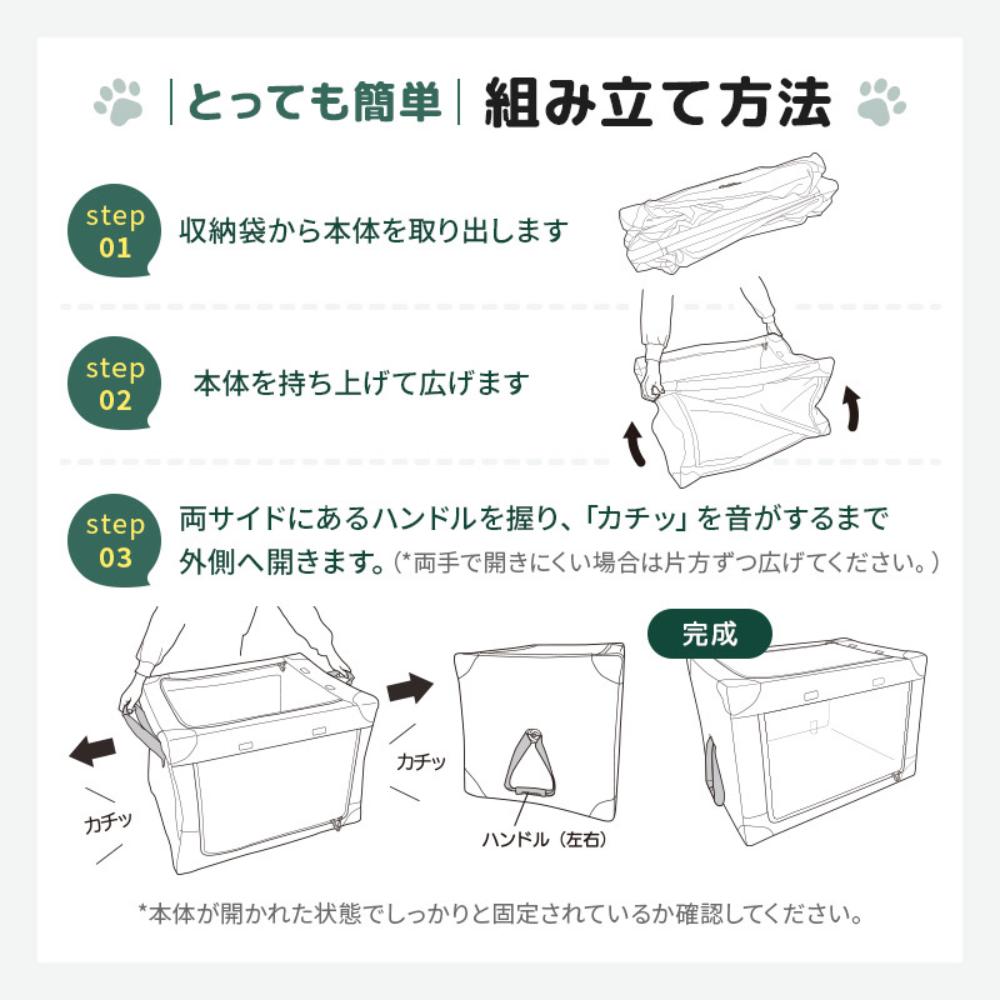 ・組み立て、収納時や使用時は、近くにお子さまや愛犬を近づけないでください。 ・愛犬は思わぬ動作をしますので、さまざまな条件により破損したりする場合があります。 飼い主さまの責任において充分な安全管理を行なってください。 ・お子さまに組み立て・収納をさせないでください。 ・本製品の中に人が入ったり、上に乗ったりしないでください。また本体の上に物を置いたり、積み重ねたりしないでください。 ・水平でない場所や、段差のある場所には設置しないでください。必ず平らな場所に完全に組み立ててから使用してください。 ・ストーブなどの暖房器具や火気の近くでは使用しないでください。破損や変形の原因となります。 ・万一落下や強い衝撃により、ひび割れ・破損・変形が生じた場合は、ただちに使用を中止してください。 ・濡れたまま放置しないでください。色が他の物に移ることがあります。 ・長時間直射日光に当てたり、野外に放置しないでください。 ・使用前は必ず、変形や破損、各部に緩みやガタつきなどがないことを確認してください。 ・製品いずれかの部品に異常が見られる場合は、使用しないでください。 ・クレート内に複数の愛犬を入れないでください。 ・狭い空間に不慣れな愛犬への使用は愛犬にストレスを与えます。短時間ずつ慣らしてから様子を見て使用してください。 ・愛犬に異変を感じた時は、すぐに使用を中止してください。 ・愛犬を中に入れたまま長時間放置しないでください。 ・愛犬が逃げ出さないように、使用時はファスナーを閉めてロックをかけてください。 ・本製品は航空輸送用クレートではありません。航空輸送には使用しないでください。 ・本製品を廃棄する際は、お住まいの各自治体の区分にしたがってください。 ・本製品を分解したり、改造はしないでください。正常な強度を保てなくなったり思わぬ事故の原因となります。
