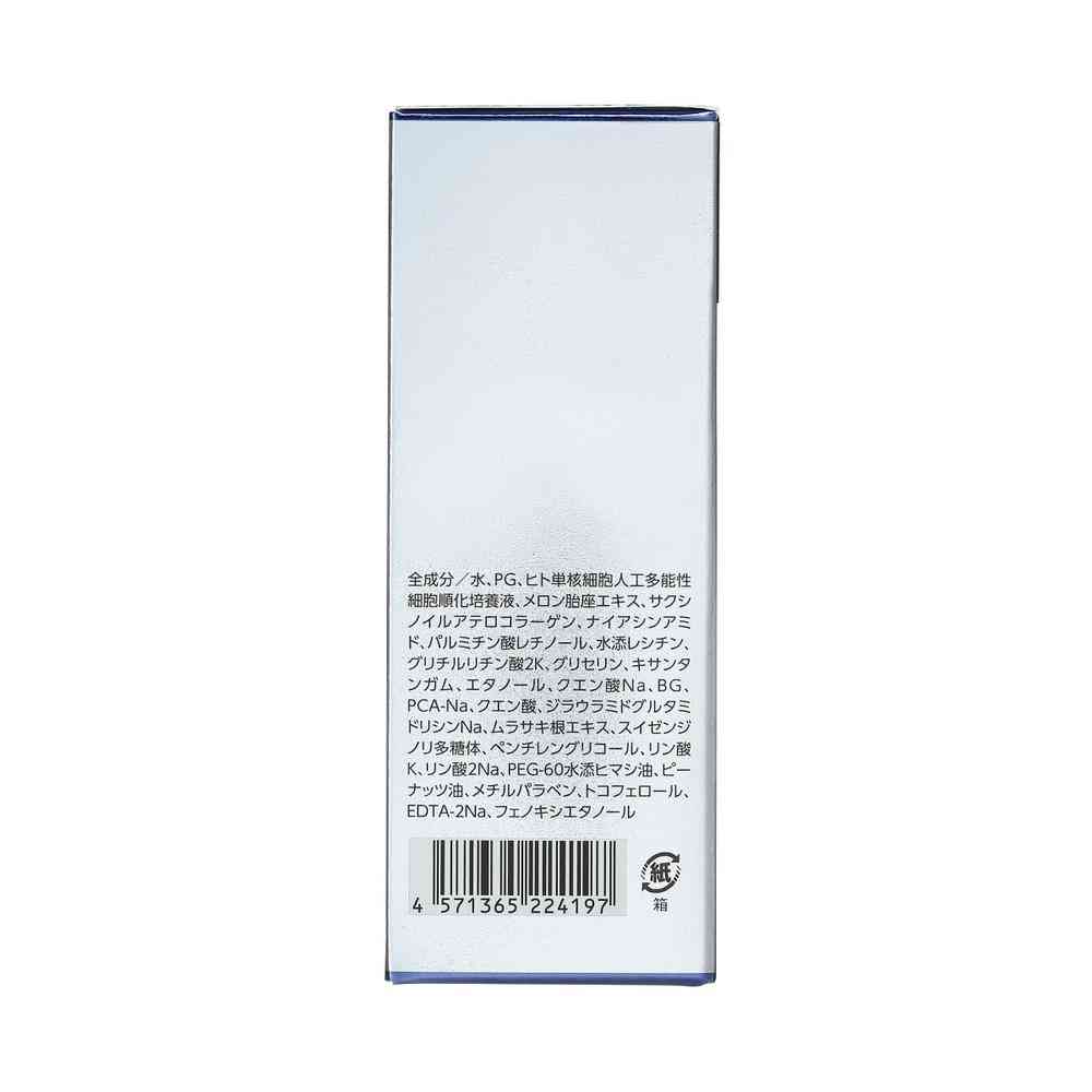 水、PG、ヒト単核細胞人工多能性細胞順化培養液、メロン胎座エキス、サクシノイルアテロコラーゲン、ナイアシンアミド、パルミチン酸レチノール、水添レシチン、グリチルリチン酸2K、グリセリン、キサンタンガム、エタノール、クエン酸Na、BG、PCA-Na、クエン酸、ジラウラミドグルタミドリシンNa、ムラサキ根エキス、スイゼンジノリ多糖体、ペンチレングリコール、リン酸K、リン酸2Na、PEG-60水添ヒマシ油、ピーナッツ油、メチルパラベン、トコフェロール、EDTA-2Na、フェノキシエタノール