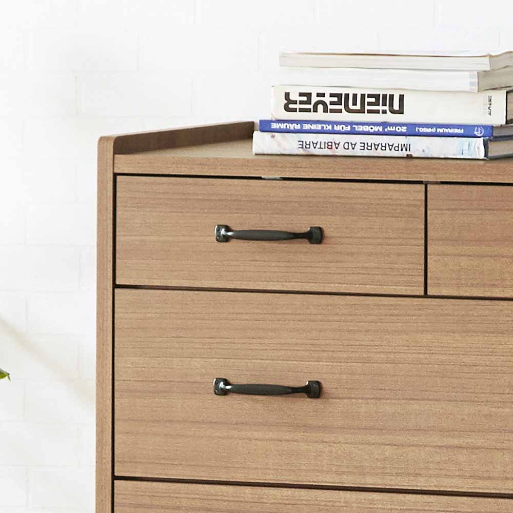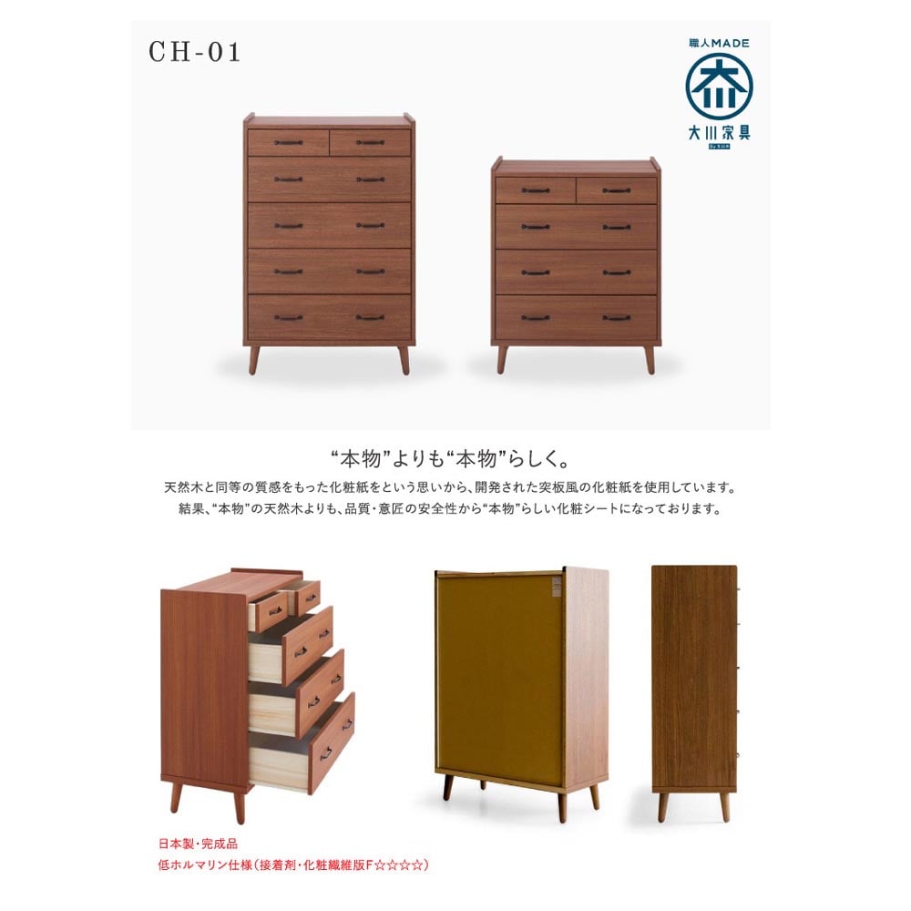 ●北欧風のオシャレな幅80cmのハイチェスト。●家具の産地【大川市】にて生産。●引出し(大)はレール付きで開閉も楽々。●脚付きなのでお掃除も楽々。●脚高:14cm。●引出し(大)内寸:幅71×奥33.5×高14cm。●引出し(小)内寸:幅34×奥33.5×高10cm。●カラー:ウォールナット色。●生産国:日本。