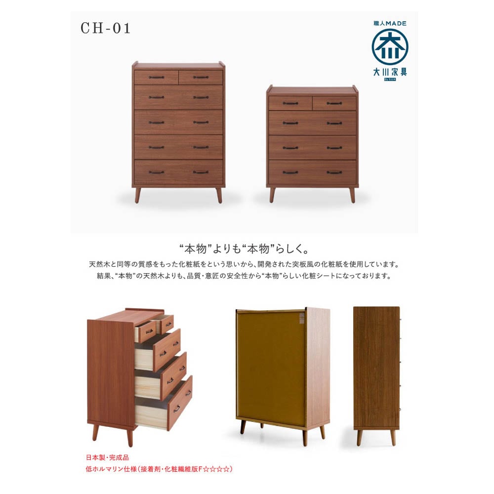 ●北欧風のオシャレな幅80cmのハイチェスト。●家具の産地【大川市】にて生産。●引出し(大)はレール付きで開閉も楽々。●脚付きなのでお掃除も楽々。●脚高:14cm。●引出し(大)内寸:幅71×奥33.5×高14cm。●引出し(小)内寸:幅34×奥33.5×高10cm。●カラー:チーク色。●生産国:日本。