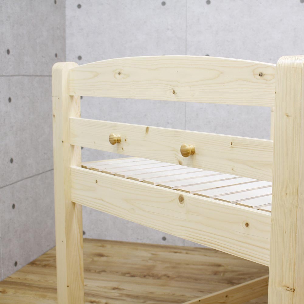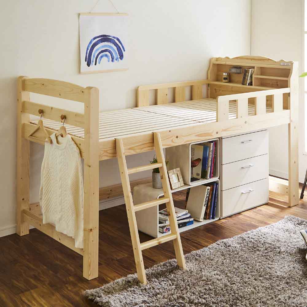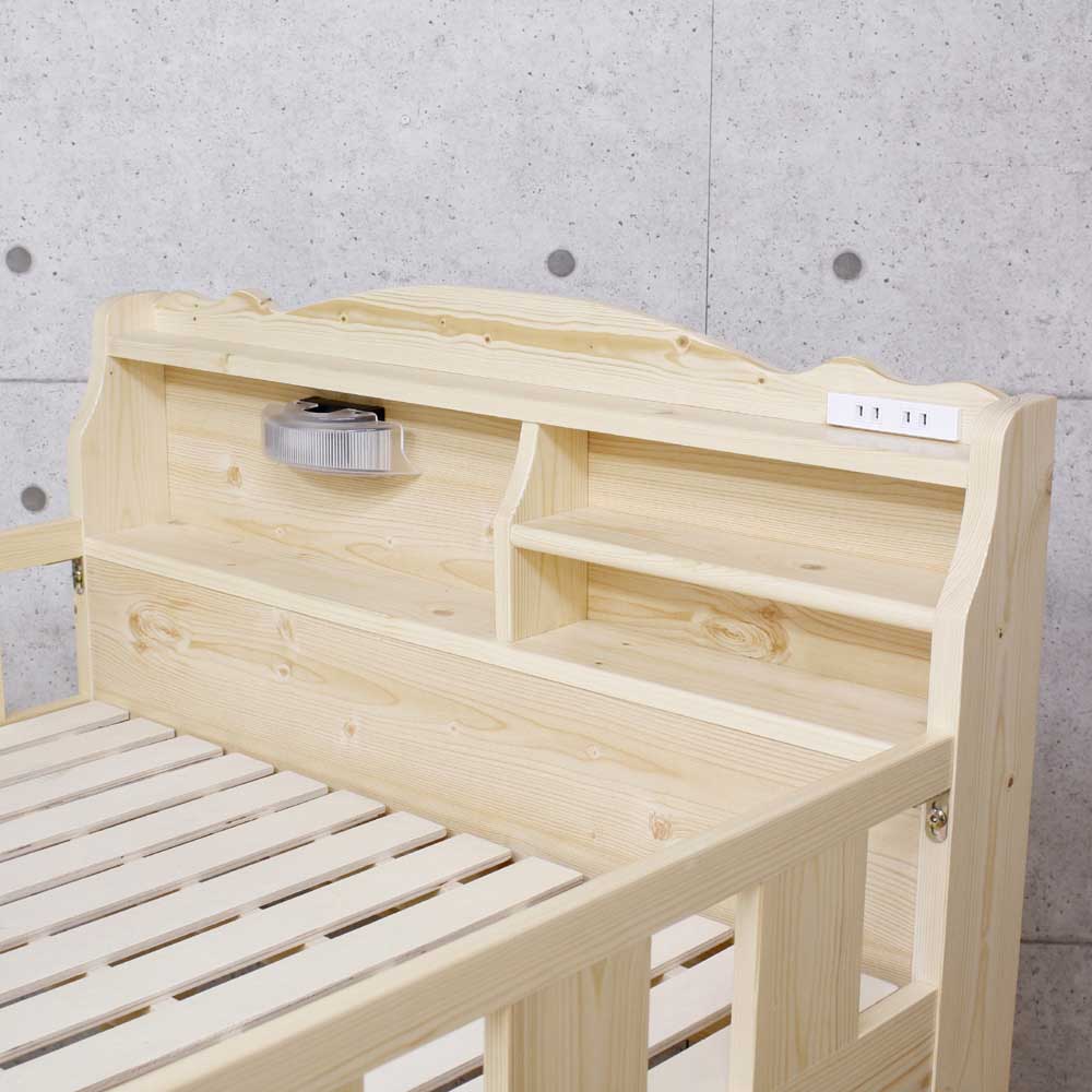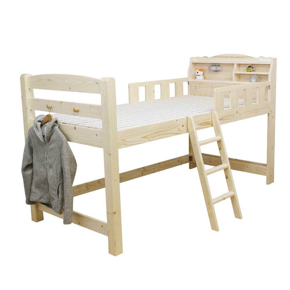 ●材料は、建築資材などに使われるフィンランドパイン材を採用。●ヘットボード部分は照明・充電に便利な2口コンセント付き。●ベッド下の空間も有効活用可能でお子様の秘密基地としてもご利用可能。●カラー:ナチュラル色。●生産国:中国。