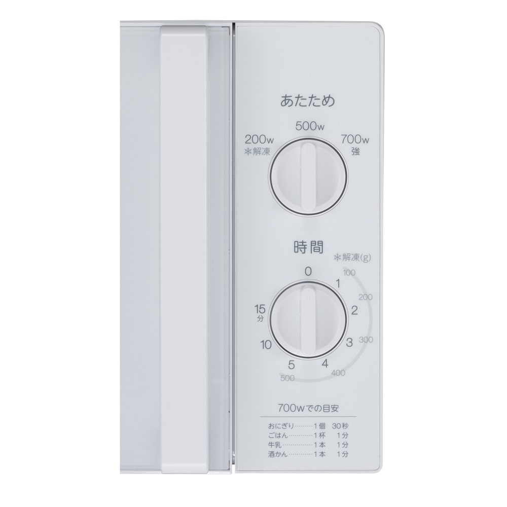 置き場所を選ばない「コンパクト設計」 ●幅44cmで、ワンルームや狭いキッチンにも設置可能です。シンプルなデザインなのですっきりとしたお部屋にコーディネートができます。●簡単操作で使いやすい。複雑な操作が不要で、つまみを回すだけであたためが可能。●あたためがスピーディ。ハイパワー700Wでお弁当やごはんなどを一気にあたためます。●コンパクトでも庫内が広々設計で、高さ19cmのものまであたためが可能です。●「700W・500W」でごはんやおかずもパワフルにあたため。「200W」で冷凍の肉や魚を上手に解凍します。 【仕様】 ●寸法:幅440×奥行き320(取っ手含354)×高さ258mm●庫内有効寸法:幅306×奥行き307×高さ190mm●質量:11kg●電子レンジ定格消費電力1150W(50/60Hz)●庫内形状:ターンテーブル式(直径255mm)開閉方式:横開き式●付属品:丸皿(ガラス製)・回転ローラー