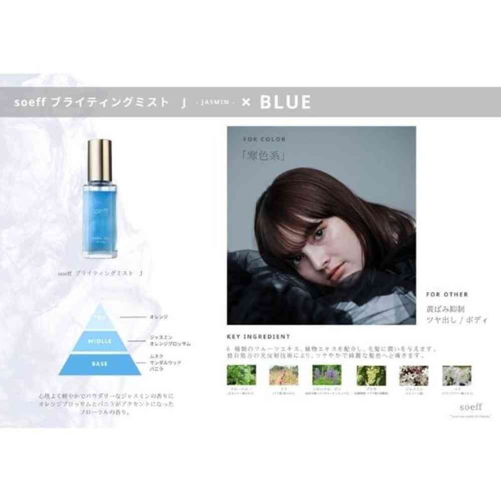 ブルーのオイルミスト。 寒色カラー向け、黄ばみ抑制、ツヤ出し、ボディ。 6種類のフルーツエキス、植物エキスを配合し、毛髪に潤いを与えます。 独自処方の光反射技術により、ツヤやかで綺麗な髪色へと導きます。 心地よく軽やかでパウダリーなジャスミンの香りにオレンジブロッサムとバニラがアクセントになったフローラルな香り。 ※使用する前に、よく振ってラメを全体に混ぜてください。