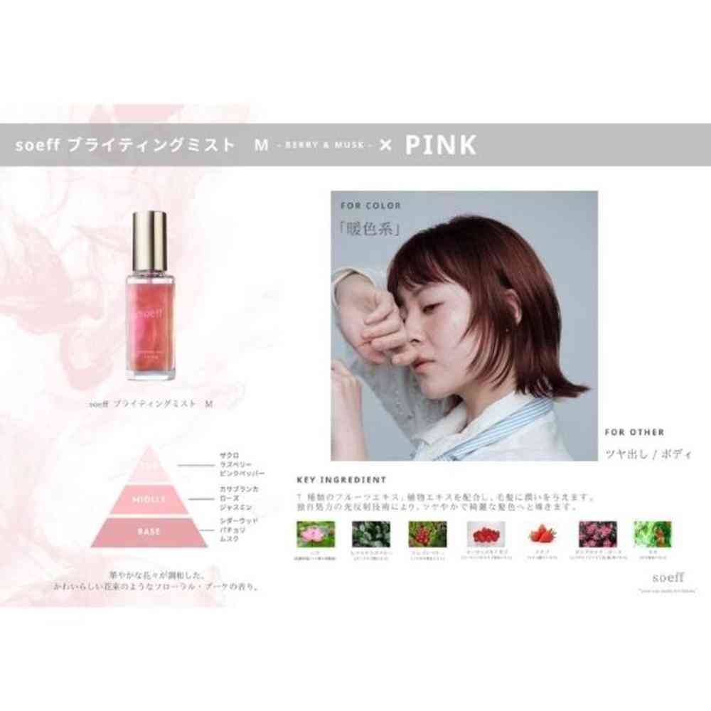 ピンクのオイルミスト。 暖色系カラー向け、ツヤ出し、ボディ。 7種類のフルーツエキス、植物エキスを配合し、毛髪に潤いを与えます。 独自処方の光反射技術により、ツヤやかで綺麗な髪色へと導きます。 華やかな花々が調和した、かわいらしい花束のようなフローラル・ブーケの香り。 ※使用する前に、よく振ってラメを全体に混ぜてください。