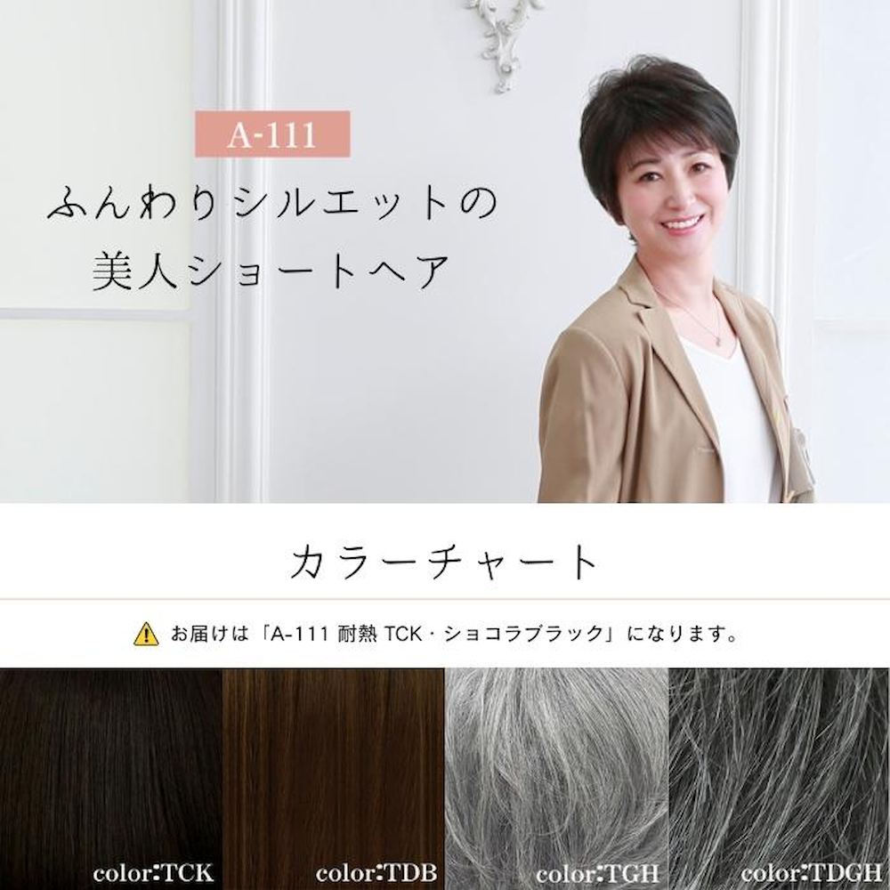 プリシラ オールウィッグ ミセス ミニマムショート A-111 耐熱 TCK・ショコラブラック ふんわりシルエットの美人ショートヘア 【新ファイバー・伸縮キャップ】 人毛のような自然さの新ファイバーと、暑くなりにくく、つけ心地も快適な伸縮キャップを使用。 ※モニターの設定や機種、撮影の関係上実際とは色味が若干異なる場合がございます。予めご了承ください。 【返品・交換について】 以下の場合は返品・交換をお受けできません。 1.お客様の不注意により破損、不足、汚損した場合 2.お客様都合の場合(例:注文間違い。色、デザインが気に入らない。また思っていたものと違う場合など。) 3.上記「返品・交換対象」に該当するものであっても商品到着後8日以内にご連絡がなかった場合、また一度でも使用された場合 ※商品が届いたらすぐに内容をご確認ください。ウィッグは直接肌に着けるものであるため、開封・未開封に関わらず不良品以外の返品・交換はお受けしておりません。 (お求めの際はよくご確認の上ご購入をお願い致します)