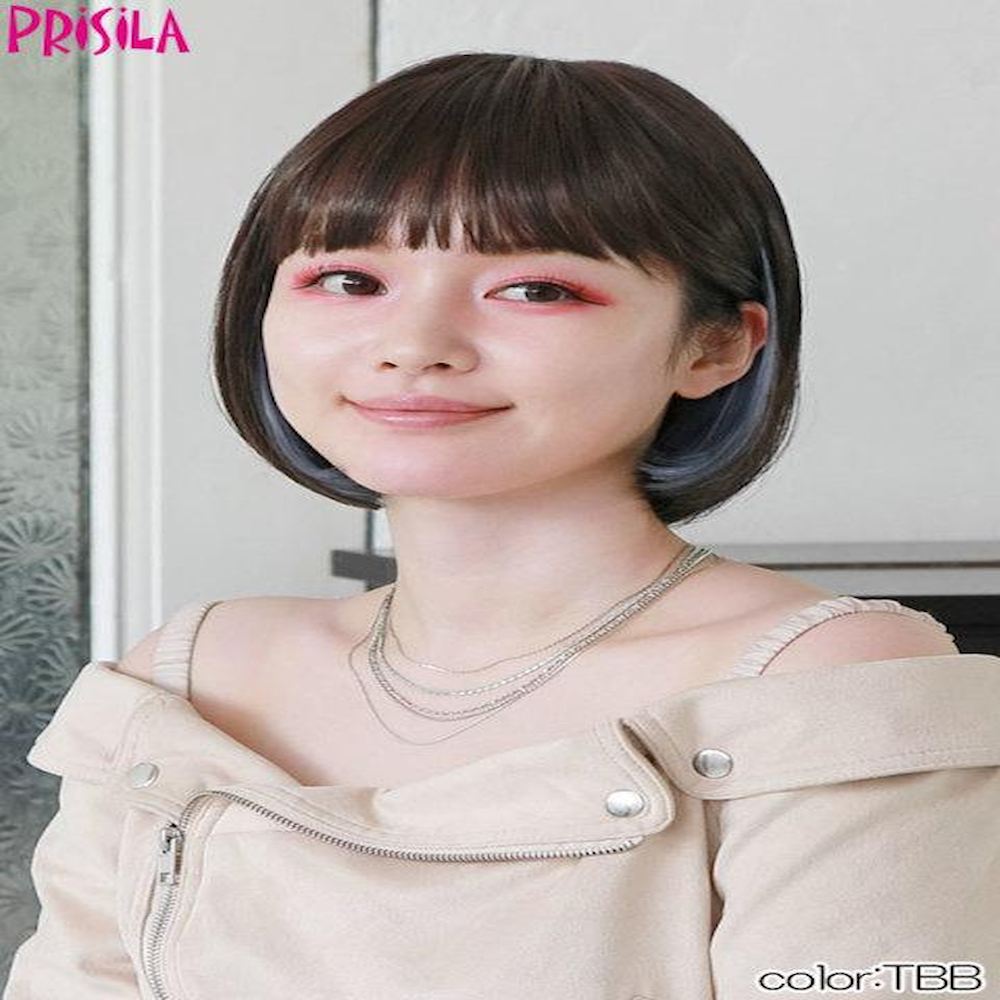 耐熱ウィッグ フルウィッグ ボブスタイル 長めボブ ナチュラルヘア 人工スキン付き ワンカール毛先 ぱっつん前髪 快適キャップ ブルーブラックカラー