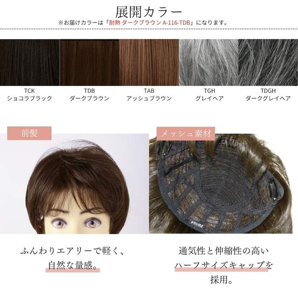 プリシラ ミセス六分ウィッグ フェザーカールハーフ 耐熱 ダークブラウン A-116-TDB 頭頂部を覆って広範囲をカバーする六分ウィッグ ※耐熱温度180度、コテやカーラーで巻く場合は同封の取扱説明書をご覧ください。 ※モニターの設定や機種、撮影の関係上実際とは色味が若干異なる場合がございます。予めご了承ください。 ※フルウィッグではありません。 【返品・交換について】 以下の場合は返品・交換をお受けできません。 1.お客様の不注意により破損、不足、汚損した場合 2.お客様都合の場合(例:注文間違い。色、デザインが気に入らない。また思っていたものと違う場合など。) 3.上記「返品・交換対象」に該当するものであっても商品到着後8日以内にご連絡がなかった場合、また一度でも使用された場合 ※商品が届いたらすぐに内容をご確認ください。ウィッグは直接肌に着けるものであるため、開封・未開封に関わらず不良品以外の返品・交換はお受けしておりません。 (お求めの際はよくご確認の上ご購入をお願い致します)